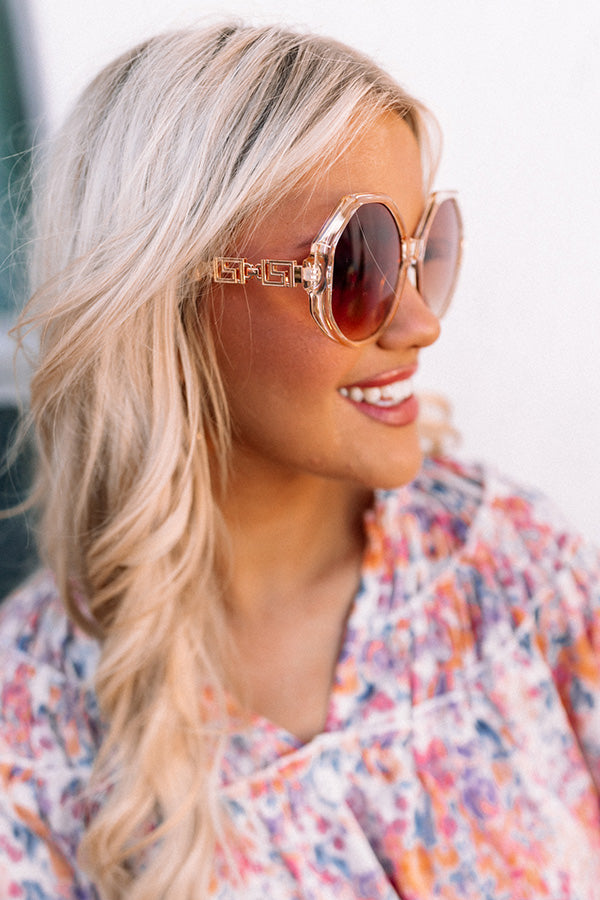 Stay shady luxuriously in our upscale 'Coastal Jam Sunnies' featuring oversized champagne colored geometric frames with gold ear pieces and dark brown tinted lenses!