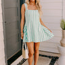 - Perfectly flirty and super sweet, this darling mini dress is a total charmer! With playful stripes and a flattering fit, it's made for twirling the day away. - Fully lined material with a white and green hued stripe pattern - A square cut neckline - 2-inch straps - Back zip closure - Structured boning on each side of the bodice - Ruffled details on each side on the skirt - A flattering silhouette that ends in a mini dress length hemline