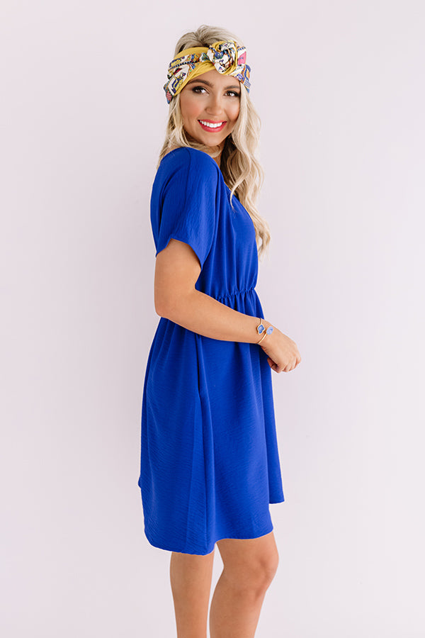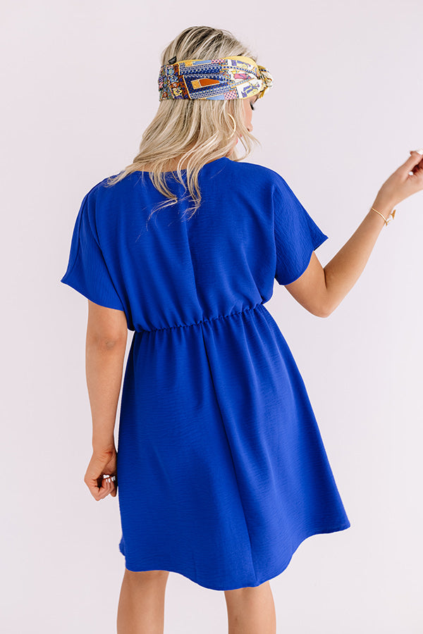 You won't find a more adorable piece to wear while "coasting in Cali" than this royal blue dress featuring lightweight breezy material, a faux wrap bodice with a v-cut neckline, short loose sleeves, accent side pockets, and a relaxed babydoll silhouette with a straight mid-thigh length hemline! You can style this piece a variety of ways, like dressed up with an accent hair scarf and a neural heel and clutch, or you can dress it down by wearing it under a denim jacket with "The Alba Wedge in Ivory," and our "Quay X JLO Reina Cat Eye Sunnies in Ivory!" Measurements