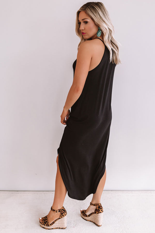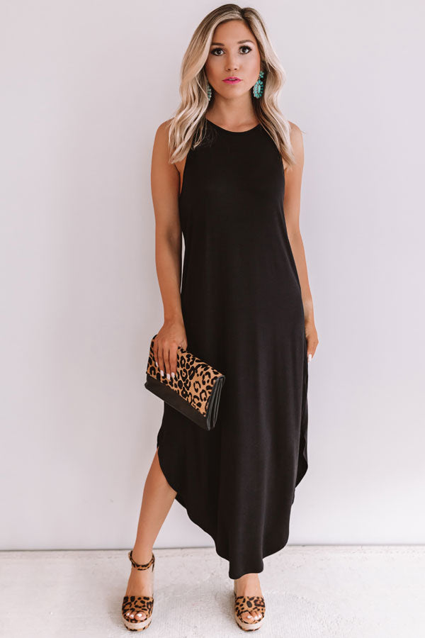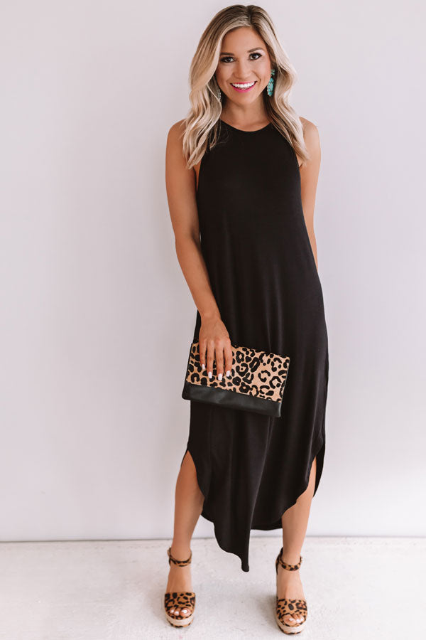 If anyone ever questions if you can combine a t-shirt and a dress, put on this orchid midi and show them how stylish it can be! This black t-shirt midi is our go-to summer comfort piece with its spaghetti straps, stretchy material, and rounded hemline with knee high slits! You can pair this piece perfectly with leopard wedges, a chic clutch, and colored statement earrings for a relaxed look that can be worn to all the cocktail parties down the coast! Measurements
