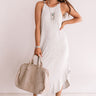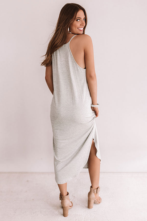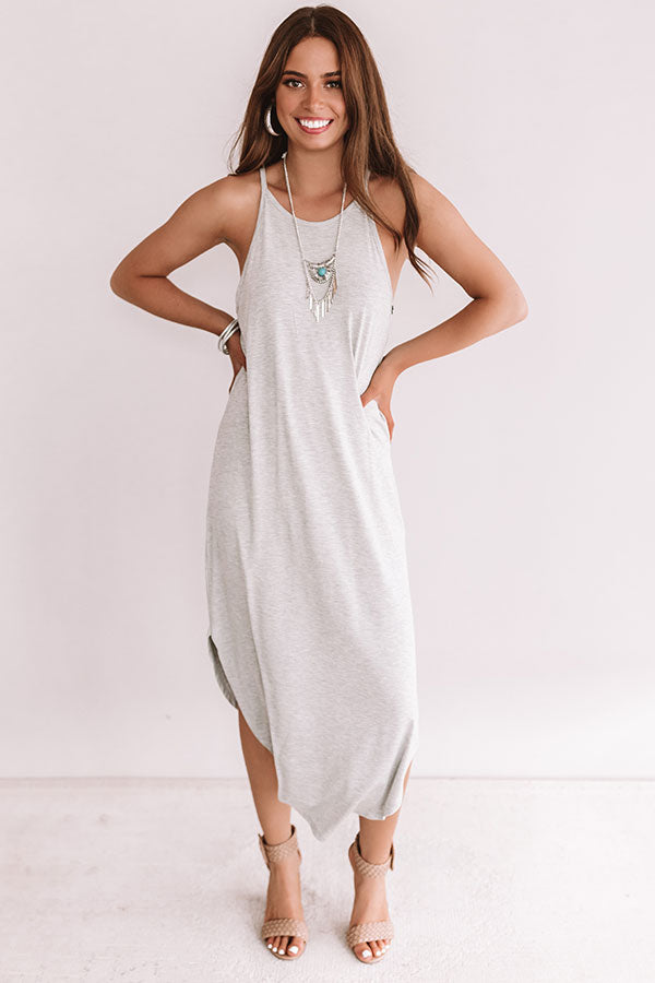 If anyone ever questions if you can combine a t-shirt and a dress, put on this orchid midi and show them how stylish it can be! This grey t-shirt sweetie is our go-to summer comfort piece with its spaghetti straps, stretchy material, and rounded hemline with knee high slits! You can pair this piece perfectly with neutral heels, an oversized tote, and simple jewelry for a relaxed look that can be worn to all the cocktail parties down the coast! Measurements