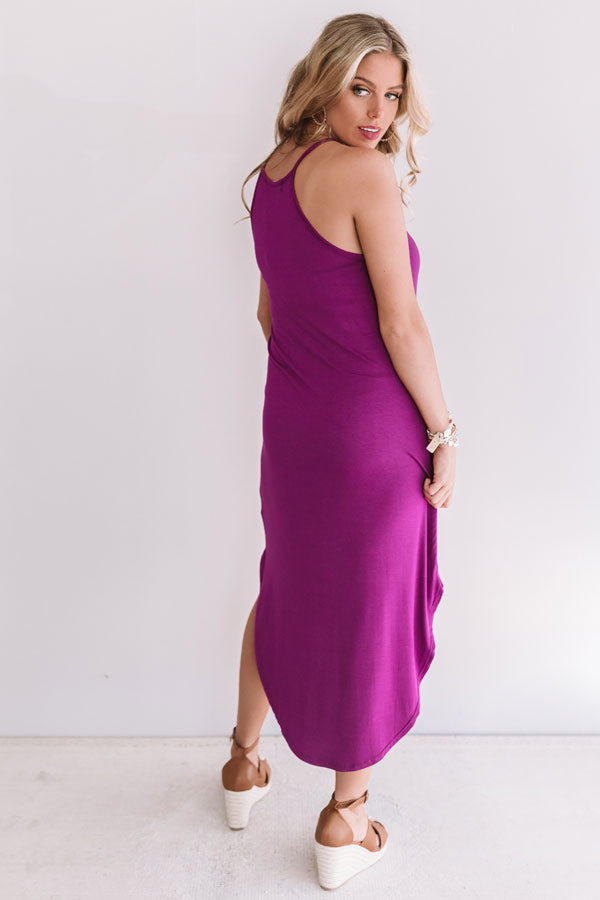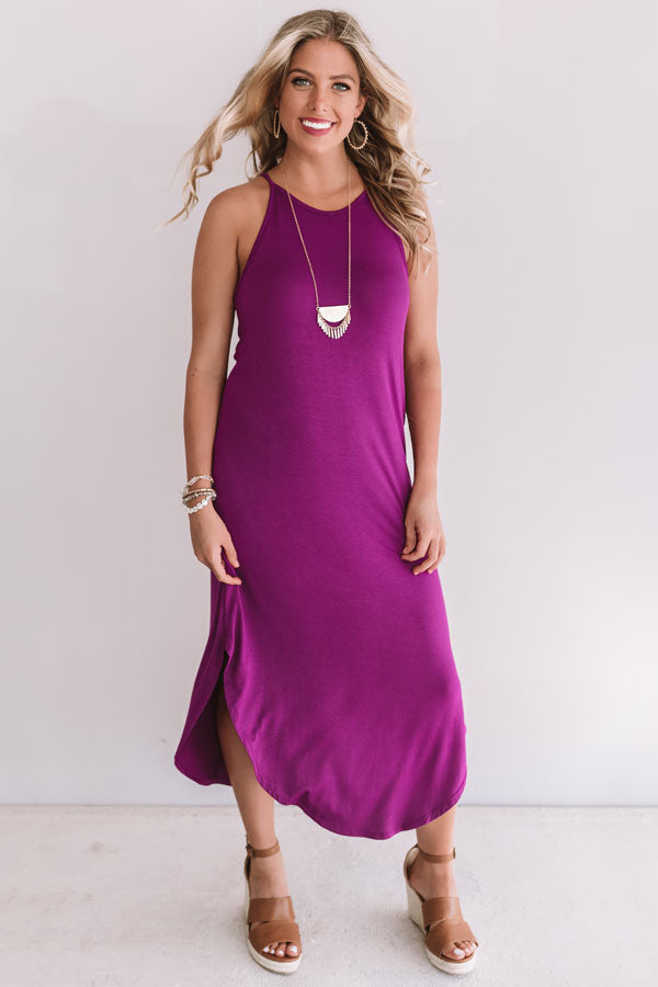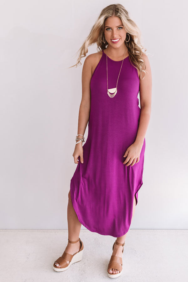 If anyone ever questions combining a t-shirt and a dress, put on this orchid midi and show them how stylish it can be! This adorable dress is our go-to summer comfort piece with its stretchy lightweight material, spaghetti straps with a racerback, a high rounded neckline, and a relaxed silhouette that falls into a rounded hemline with knee high slits! You can pair this piece perfectly with neutral wedges, or it can be worn with "The Tipton Espadrille Wedge in Grey," our "All Caught Up Headband in Grey," and our "Nightlife Luxury Snake Print Tote in Grey!" Measurements