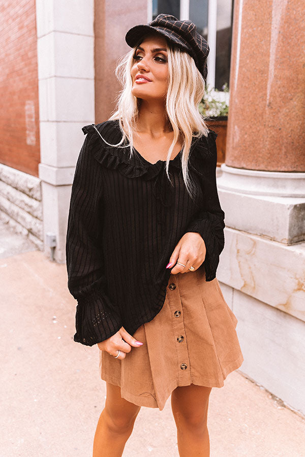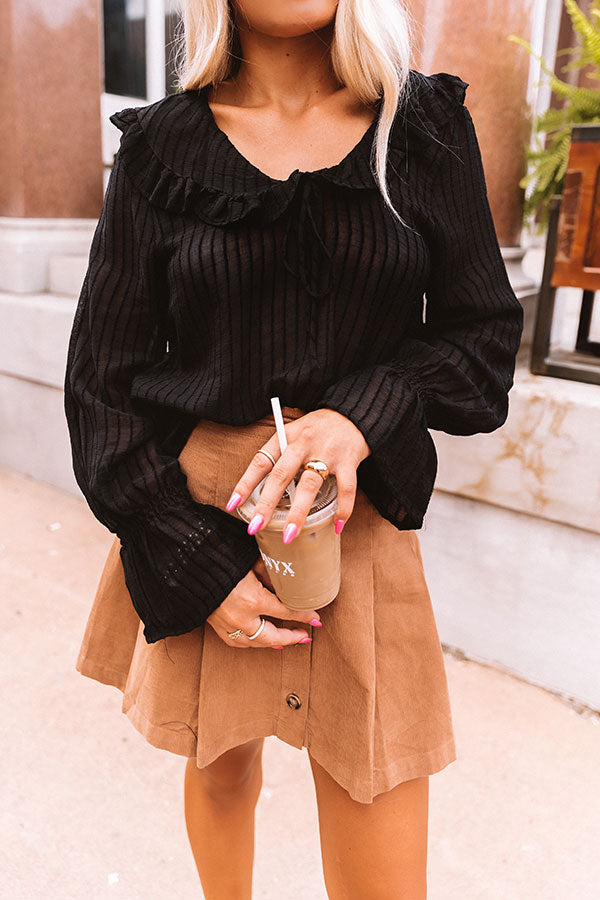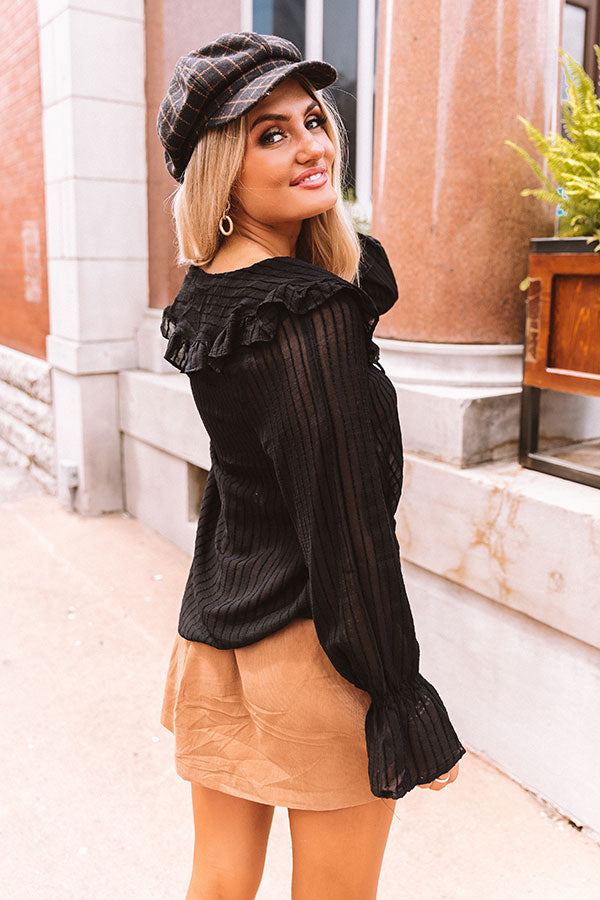 Arrive to happy hour in style with our chic black 'Cocktail Meeting Shift Top' featuring lightweight material with vertical semi-sheer accent stripes, a scooped neckline with a ruffled tie closure trim overlay, long bishop sleeves with flared cuffs, and a relaxed silhouette that ends in a straight hemline!