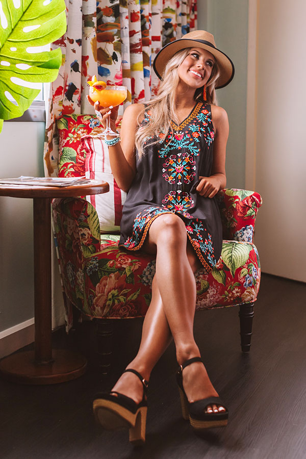 Live life colorfully in our stunning black "Cocktail Please" shift dress featuring lightweight material patterned with a blue, red, and orange embroidered floral print, a v-cut neckline, wide 3-inch shoulder straps, and an ultra relaxed silhouette that falls into a straight mid-thigh length hemline! We have styled this summer cutie with some black platform heels, a neutral sun hat, and matching statement earrings, but you can also wear it with "The Chandler Heel in Orange" and a turquoise clutch! Measurements
