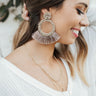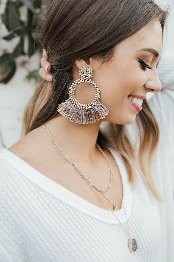 You will look like a fashion QUEEN when you wear these taupe earrings with their clustered studs and beaded hoops adorned with tassel fringe fans!