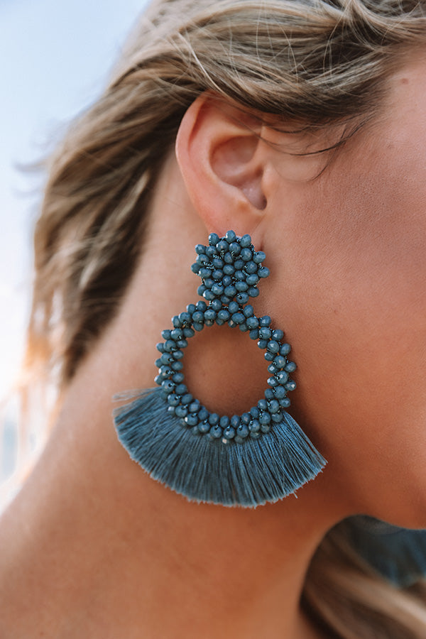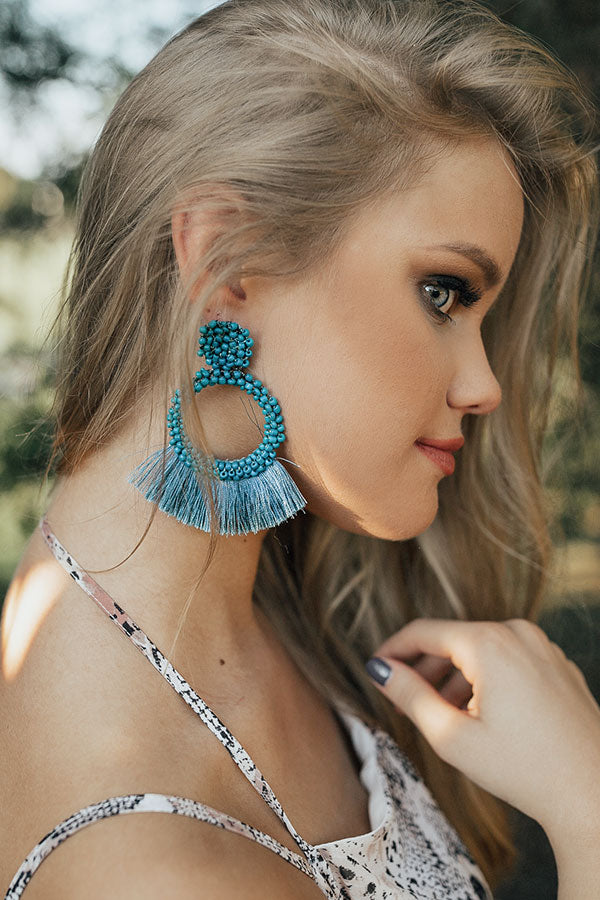You will look like a fashion QUEEN when you wear these teal earrings with their clustered studs and beaded hoops adorned with tassel fringe fans!