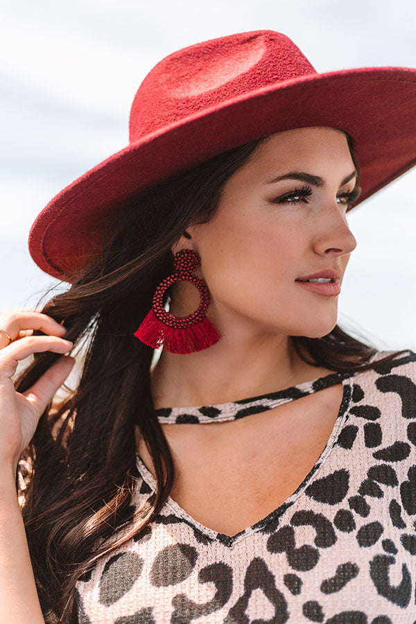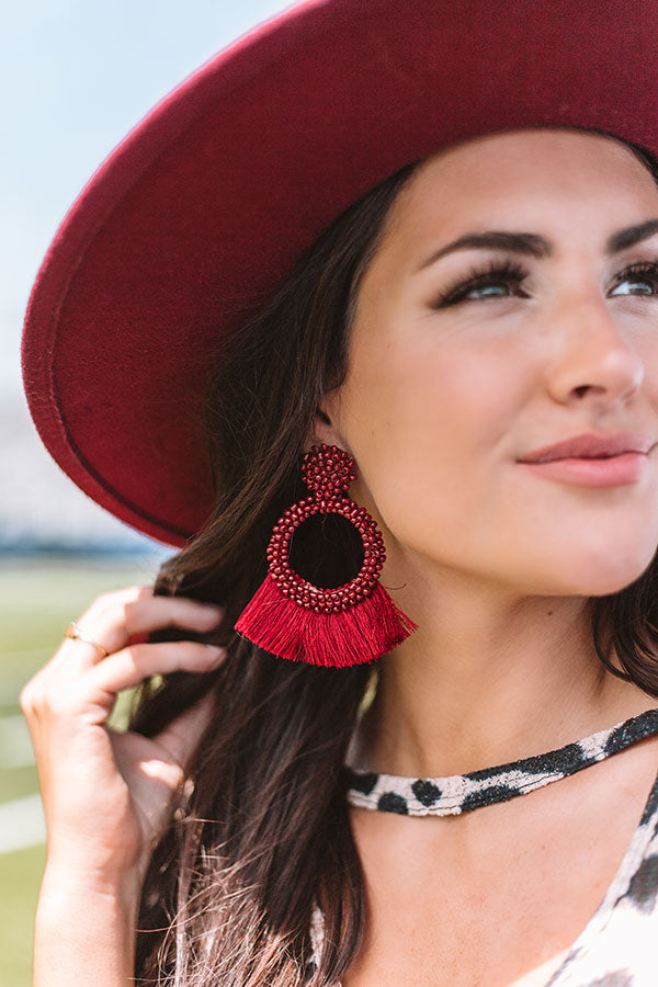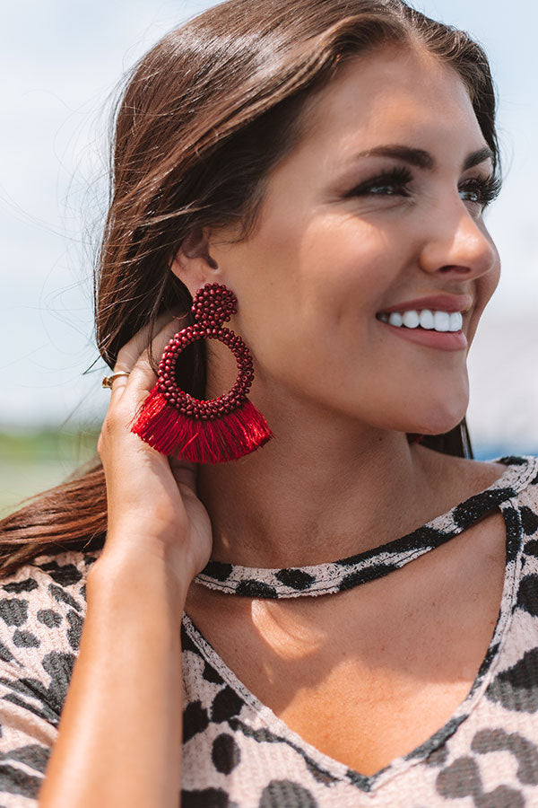 You will look like a fashion QUEEN when you wear these wine earrings with their clustered studs and beaded hoops adorned with tassel fringe fans!