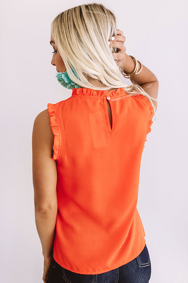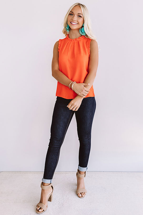 You'll be cocktail ready when you slip on this tangerine shift top with its ruffled accents, flowy material, and keyhole cutout with button closure in the back! Style with some dark washed cuffed denim, nude heels, and a matching clutch for a lively summer look that you will want to wear to every happy hour! Measurements