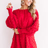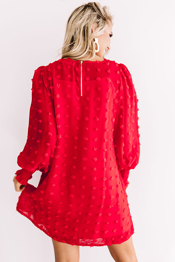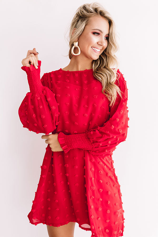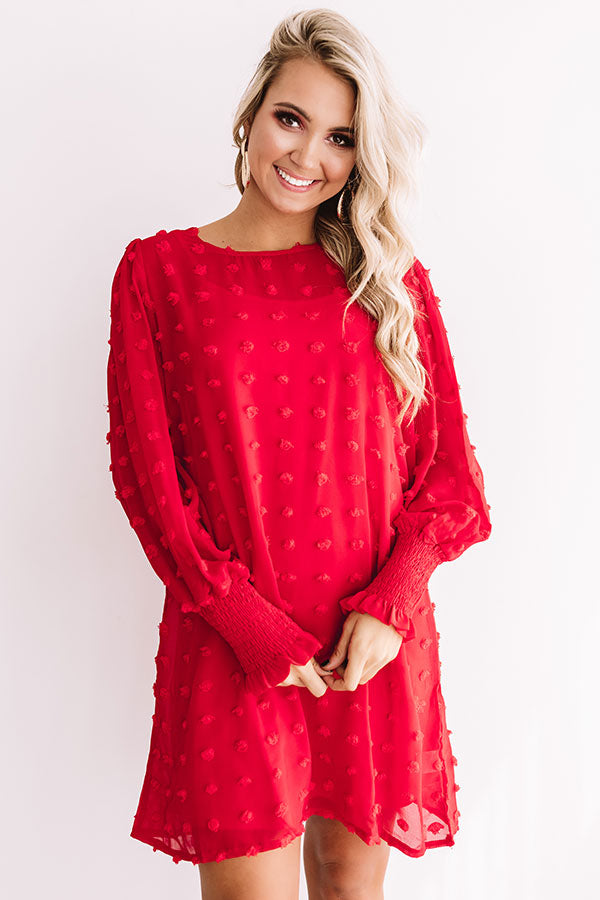 Smiles are always in fashion, and so is the red hot "Cocktails And Cuties" shift dress featuring lightweight semi sheer material, a textured polka dot pattern, long oversize bishop sleeves with smocked ruffle trim cuffs, a zipped upper back, and fan ultra relaxed silhouette that falls into an upper thigh length straight hemline! This flirty number styles perfectly with printed accessories like "The Melina Leopard Heel" and our "Concrete Catwalk Cheetah Clutch," or you can keep it neutral with "The Maude Faux Suede Peep Toe Bootie in Black" and "The Jonas Hat in Black!" Measurements