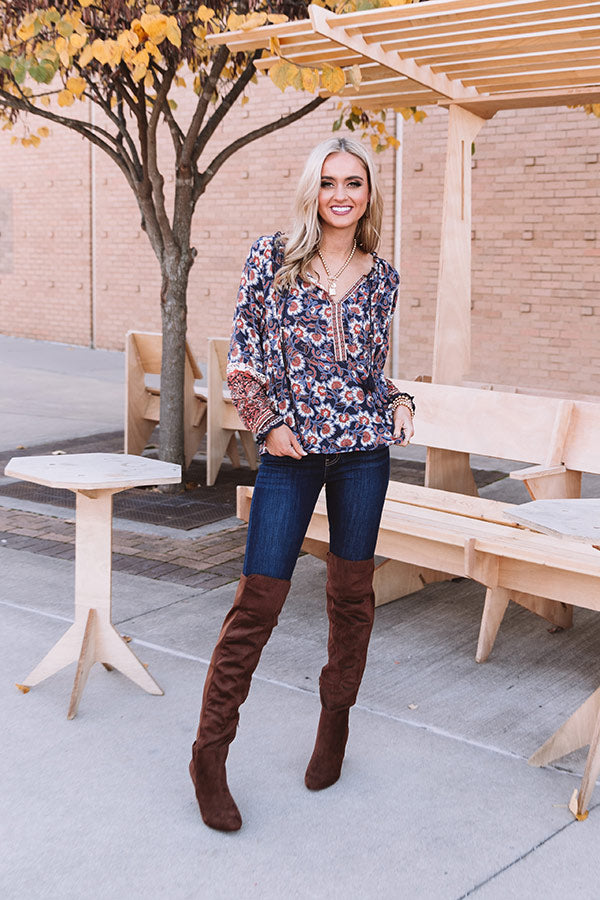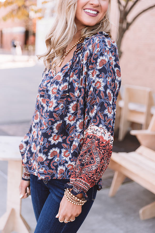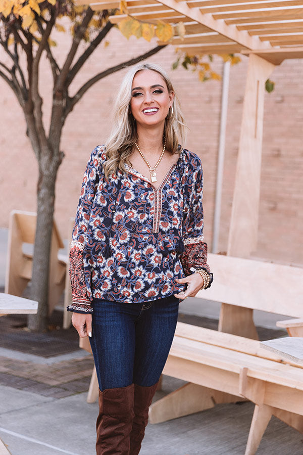 Steal the show wherever you go in our adorable navy colored 'Cocktails In Calabasas Top' featuring lightweight material patterned with an intricate cinnamon and white hued floral print, a v-cut neckline with a tie closure, long loose sleeves with subtly ribbed cuffs, and a relaxed silhouette that falls into a straight hemline!