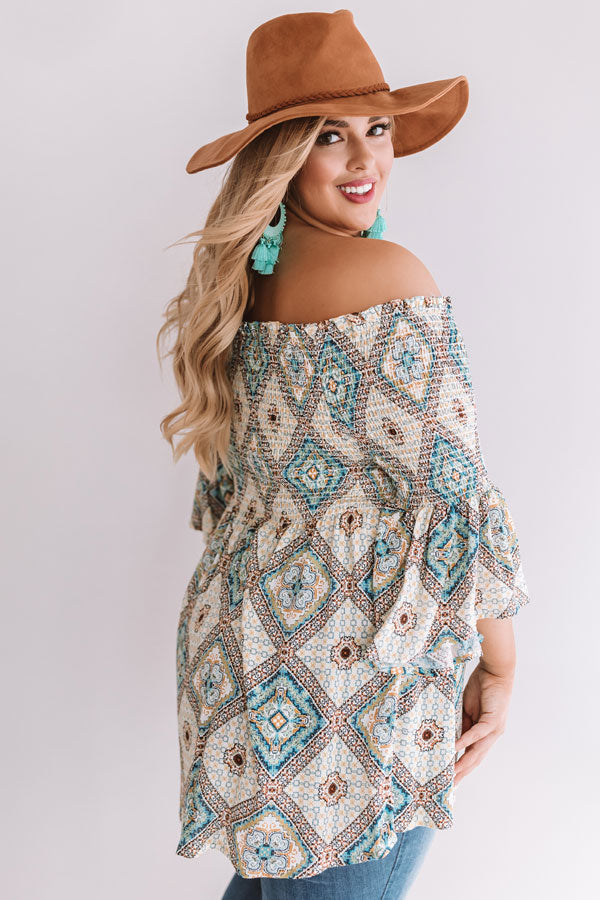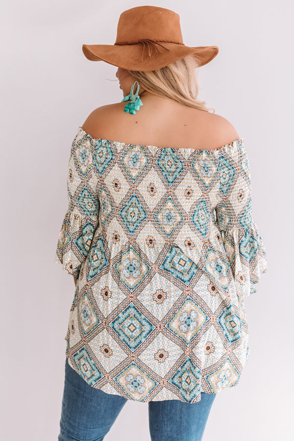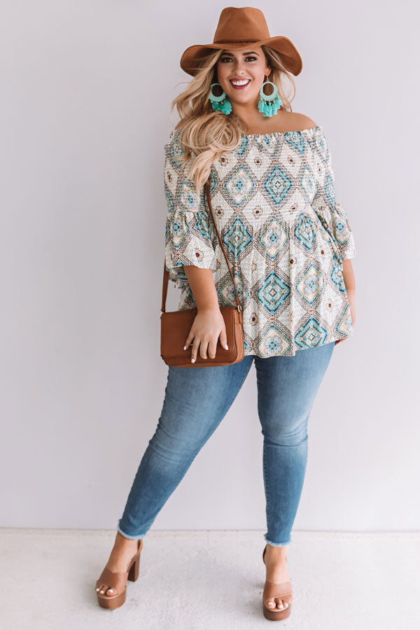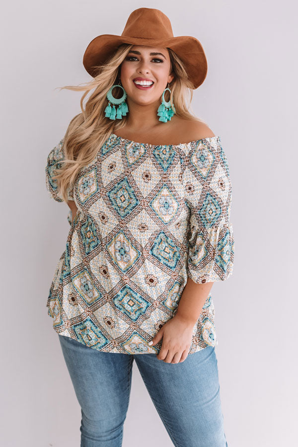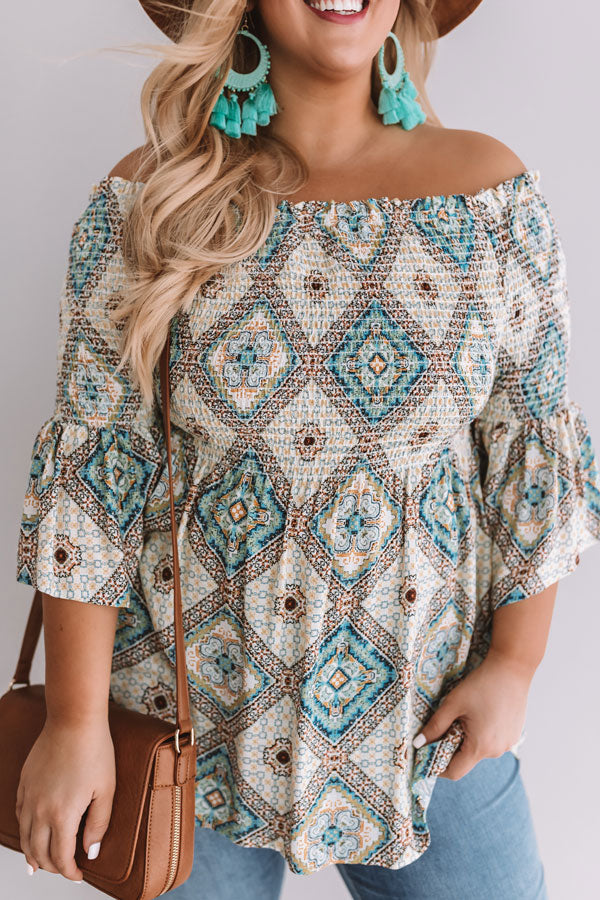 Plus Size - This gorgeous smocked top features and off-shoulder fit, flowy bodice, flared sleeves, and a boho argyle pattern!