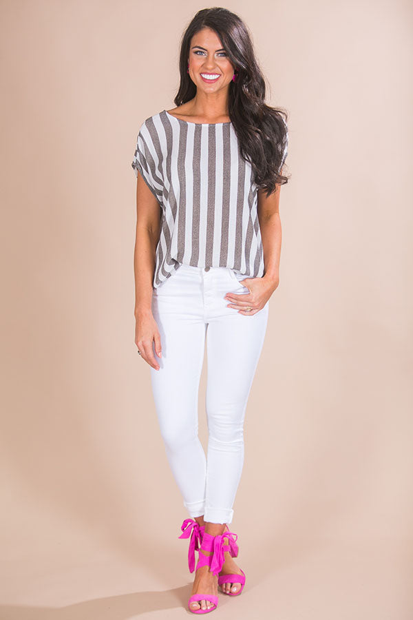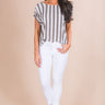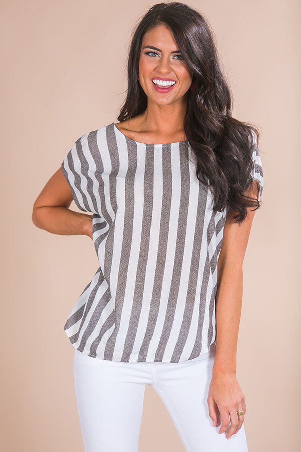 Signature black & white stripes... With a twist! This breezy babe has short sleeves, a relaxed rayon bodice & a ultra sassy twisted back. Keep things classic with a white skinny jean, or add a pop of color to your look with a colorful statement earring or heel!