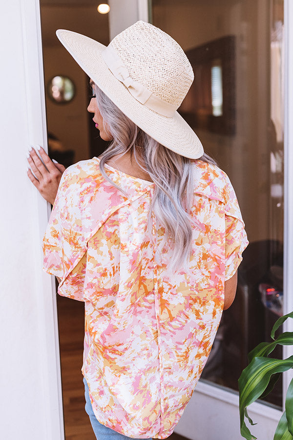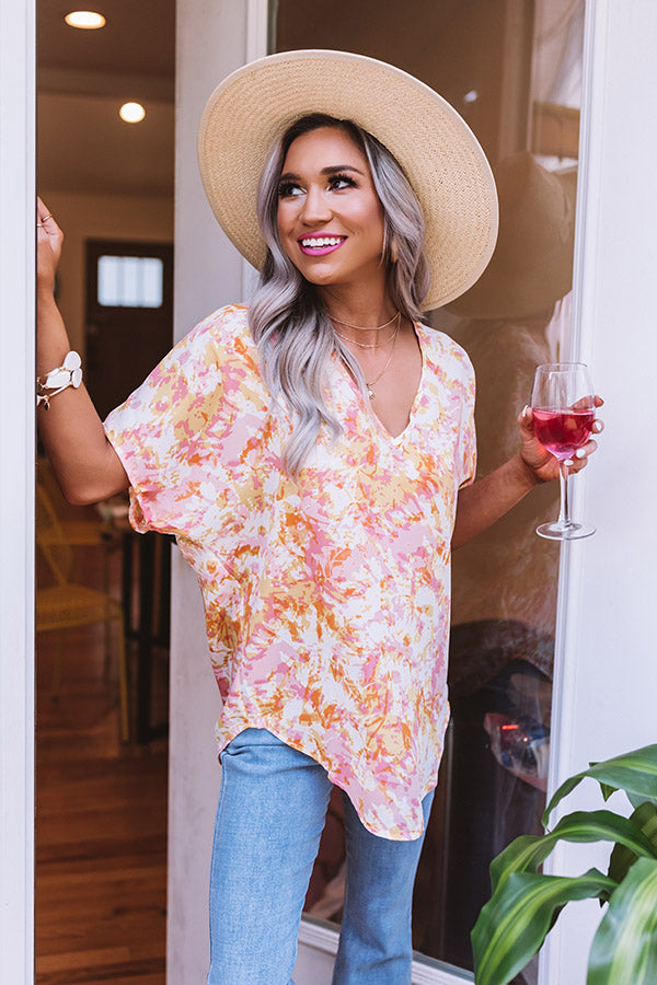 Brighten up your wardrobe with our adorable "Cocktails In Kokomo Shift Top" featuring lightweight material patterned with an intricate pink, orange, and yellow hued print, a v-cut neckline, short loose sleeves, and an ultra relaxed silhouette that falls into a rounded hemline! We have styled this summery piece with some light wash flares, brown heels, and a woven hat, but you can also wear it with some distressed white shorts, "The Mara Sandal in Persimmon," and our "Glam Expectations Faux Leather Tote in Pink!" Measurements