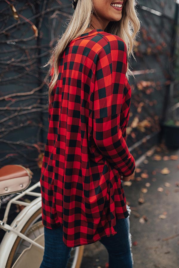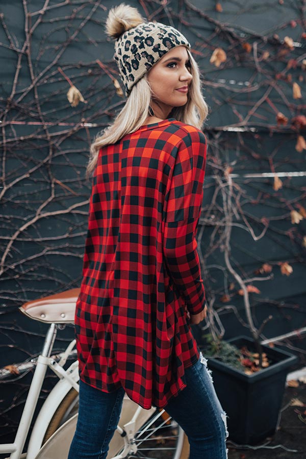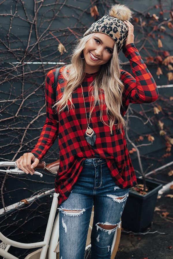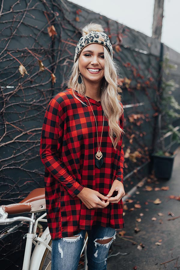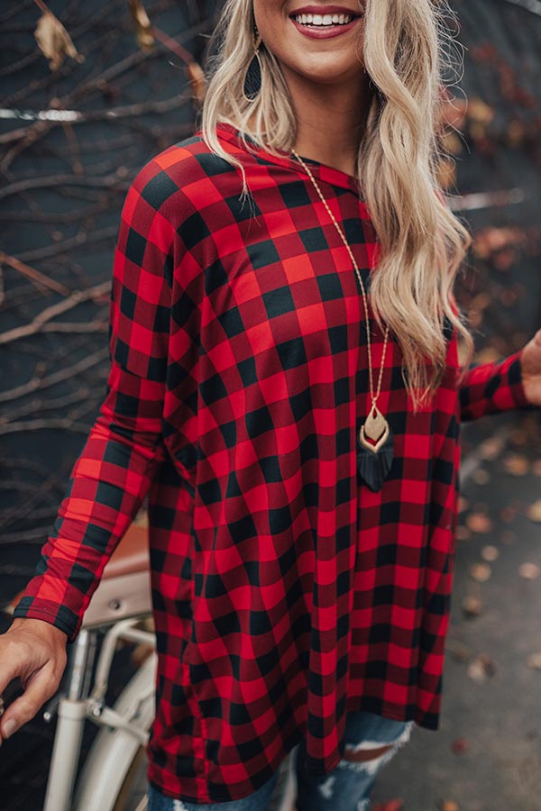 "Tis the season for buffalo check! Our red and black "Cocoa And Crushes" shift top features soft lightweight stretchy material, a high rounded neckline, long fitted PIKO sleeves, and an ultra relaxed silhouette that falls into an uneven tunic length hemline! You can style this stunning piece with some distressed ankle skinnies, a leopard beanie, and black booties, or you can wear it with some black flares, "The Mia Faux Suede Lace Up Heel in Red," and our "Going, Going, Glam Faux Leather Tote in Black!" Measurements