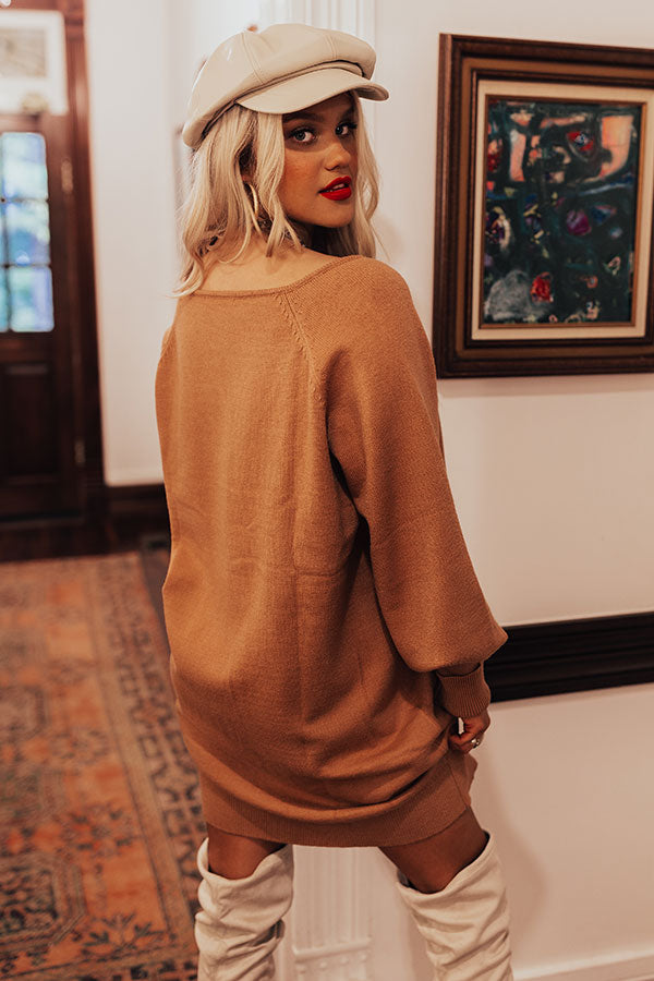 There is no better piece to look casual but still cute in than our adorable camel hued 'Cocoa And Kindness' dress featuring soft material, a wide v-cut neckline, long loose sleeves with fitted forearm cuffs, and a slouched silhouette that falls into a straight lower-thigh length hemline! Measurements