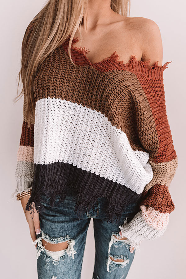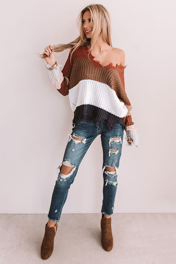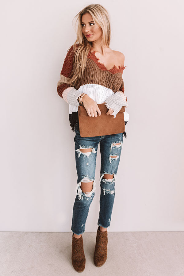 As the temps start dropping, rise to the occasion in style with the mocha colored "Cocoa Cheers Shift Sweater" featuring soft and warm loose knit material with ribbed texturing, horizontal fall hued color block stripes, a v-cut neckline that can be worn off one shoulder, long loose sleeves, distressed trim detailing, and a relaxed silhouette that falls into an uneven hemline! We have styled this adorable piece with some distressed dark wash ankle skinnies and a brown bootie and clutch, but you can also wear it with some light wash flares, "The Jess Faux Leather Heel in Black," and our "Vintage Vibes Felt Hat in Dark Rust!"