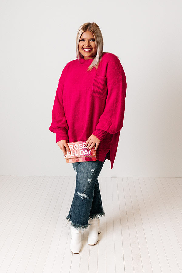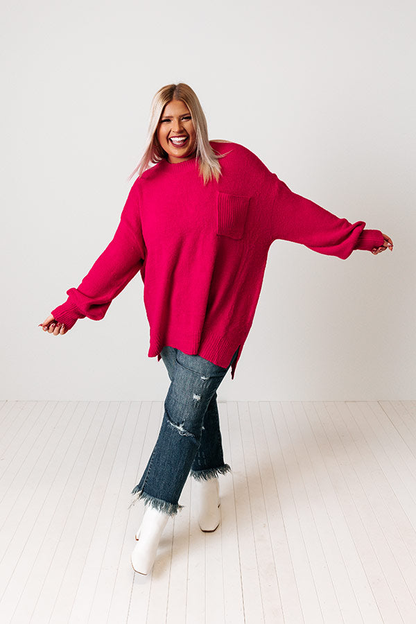 Who else is in the 'Cocoa Mood' this time of year? Yes, please! This darling plus size hot pink shift sweater features an oversized fit, balloon sleeves that gather at the wrist, a ribbed mock-turtleneck, a sew on front pocket, and a split high-low hem for extra coverage. What more could you want? Measurements