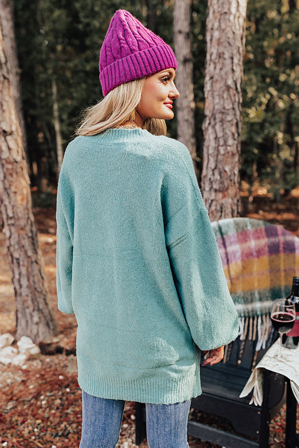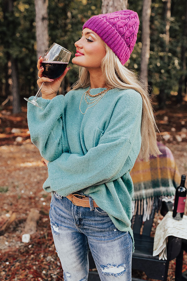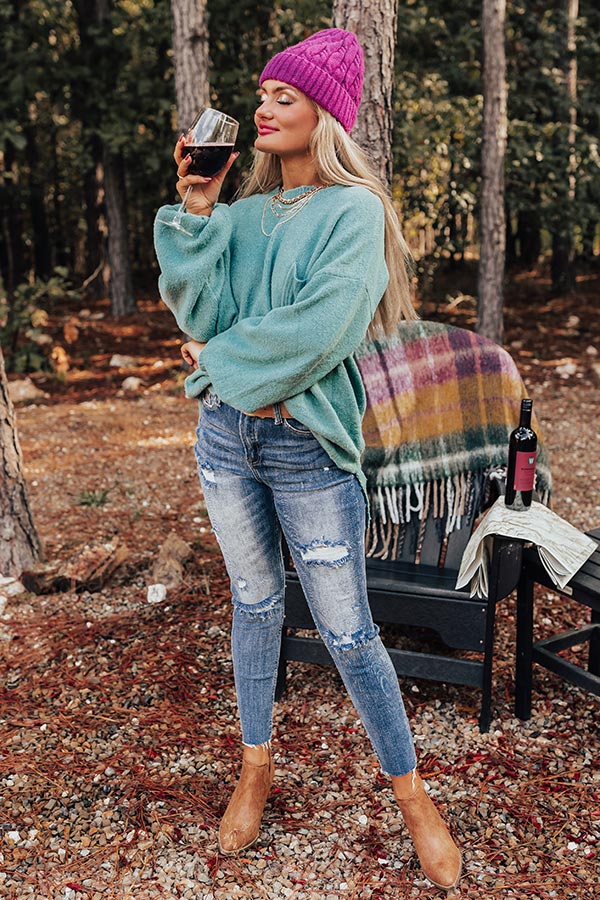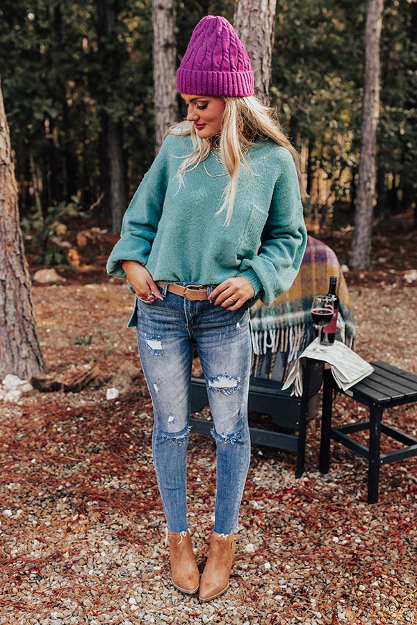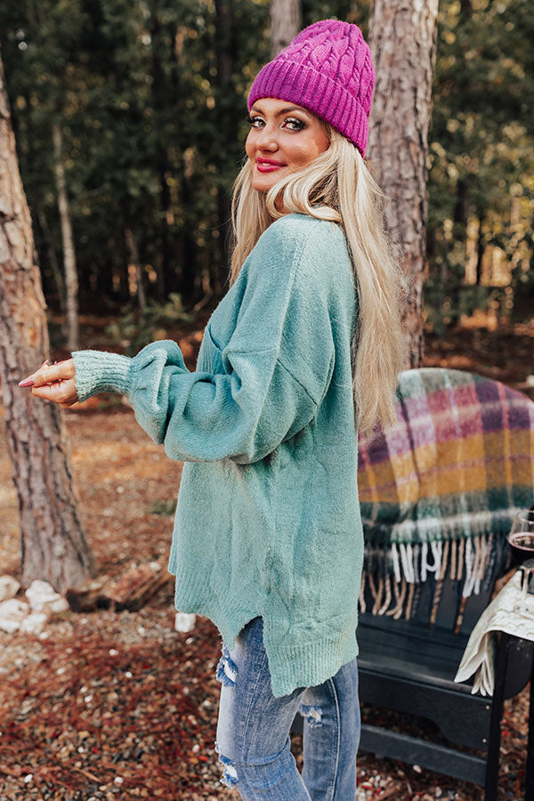 Who else is in the 'Cocoa Mood' this time of year? Yes, please! This darling turquoise shift sweater features an oversized fit, balloon sleeves that gather at the wrist, a ribbed mock-turtleneck, a sew on front pocket, and a split high-low hem for extra coverage. What more could you want? Measurements