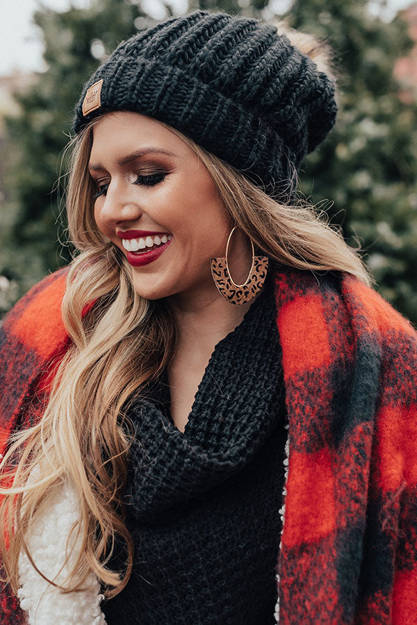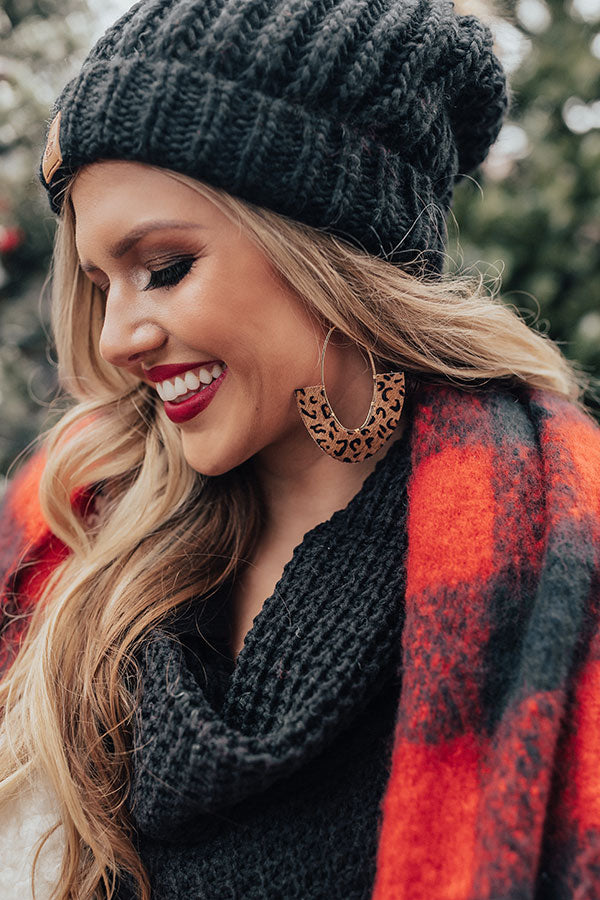 Wow the crown in our brown "Cocoa Occasion" statement earrings featuring skinny gold oval hoops with a faux leather fan accent patterned with a black leopard print!