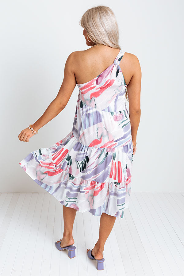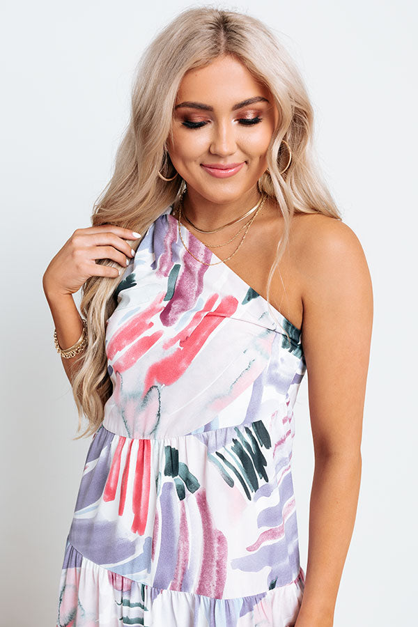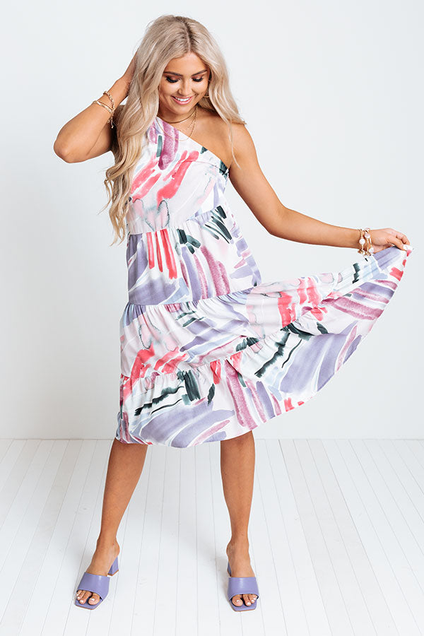 Liven up your wardrobe with our stunning 'Coconut Coladas Shift Dress' featuring lightweight breezy material patterned with an abstract purple, pink, and dark teal line print, a diagonal neckline and upper back with a single sleeveless shoulder strap, and a flowy tiered skirt silhouette that falls into an uneven mid-calf length hemline! Measurements