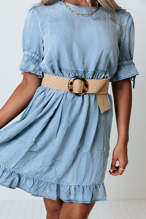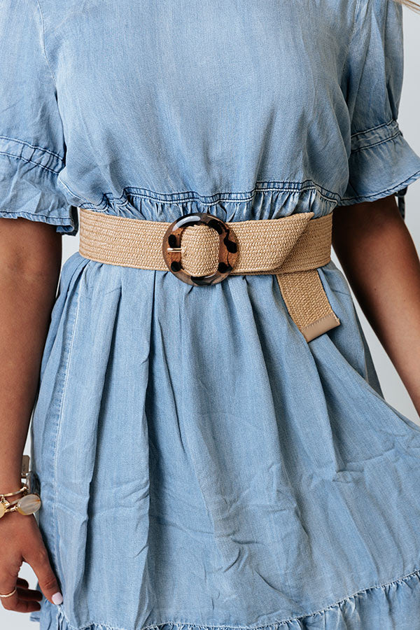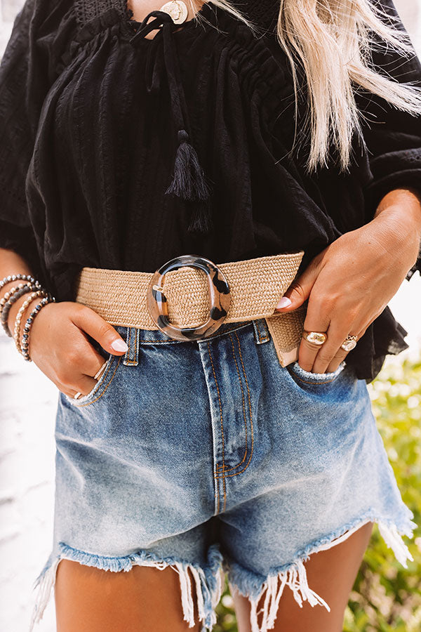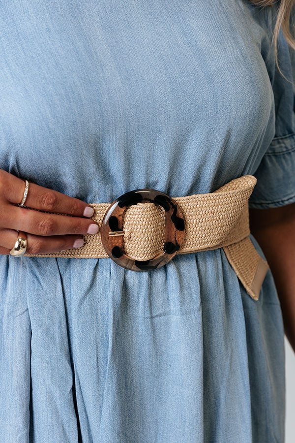 Cruise into summer in style with this adorable belt featuring a lightweight woven tan strap and an oversized tortoiseshell hoop buckle!