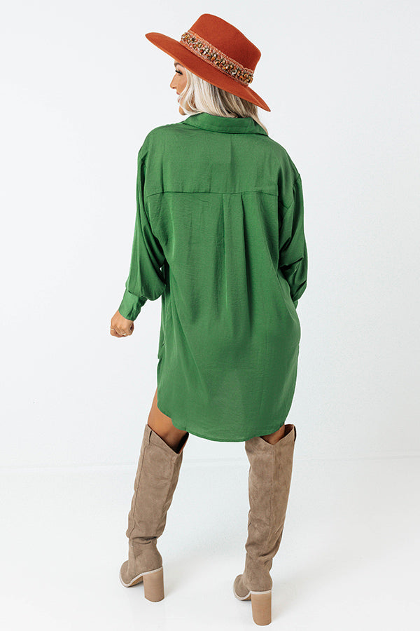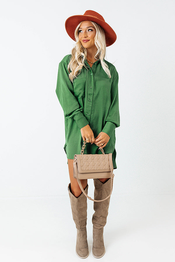 Get ready effortlessly in our simple but stylish green 'Coffee And Casual' tunic featuring lightweight satin material, a button down front with a collared neckline, long loose sleeves with button closure cuffs, a single accent chest pocket, and an oversized silhouette that falls into a rounded upper-thigh length hemline!