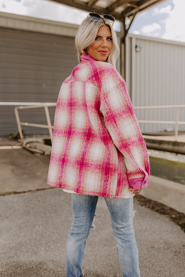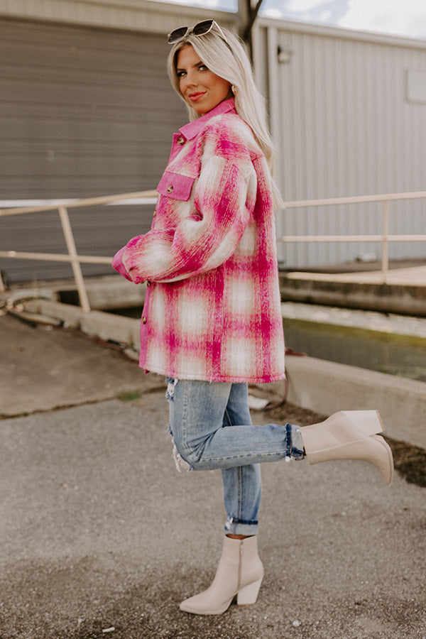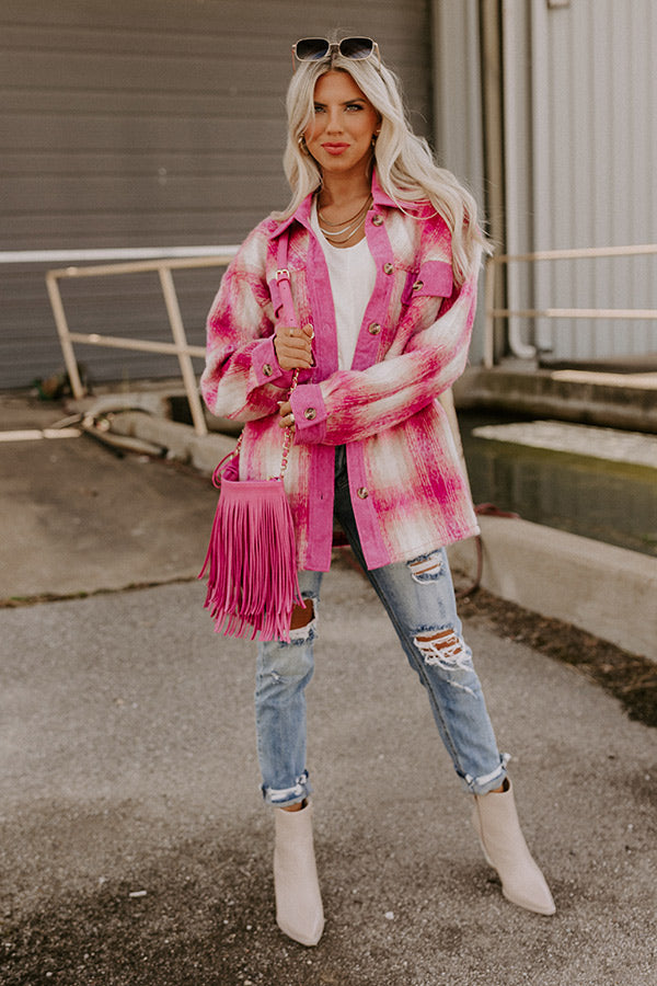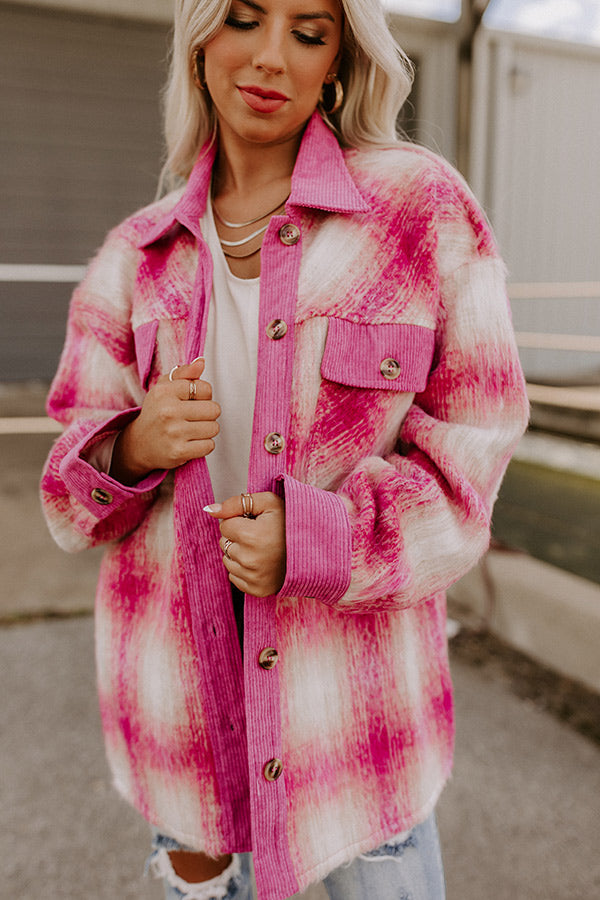 A fall wardrobe staple, our on-trend 'Coffee And Smiles' jacket featuring warm material patterned with a pink plaid print, a button down front with a collared neckline, long loose sleeves with button closure cuffs, two accent chest pockets with flap closures, and a relaxed silhouette that ends in a straight hemline!