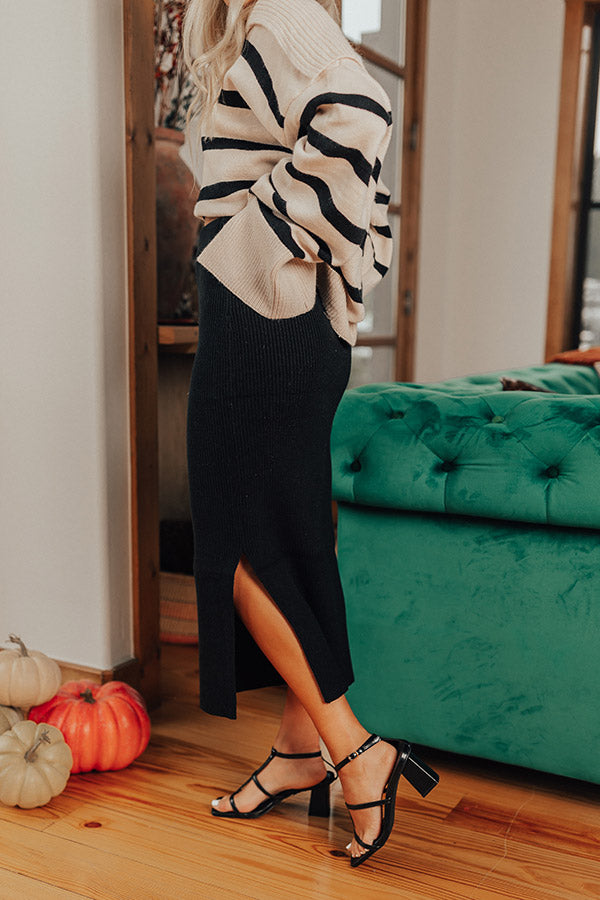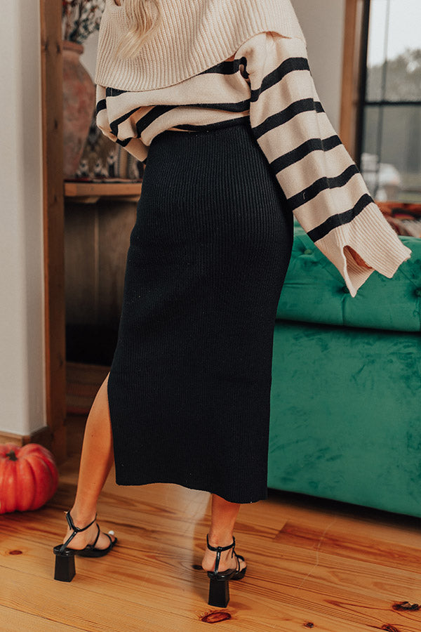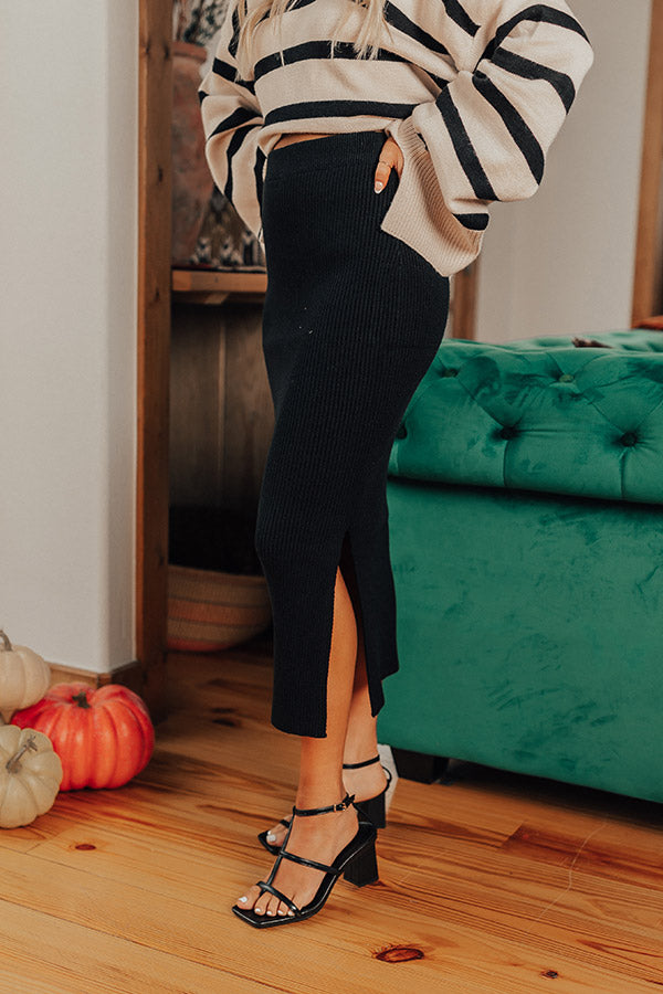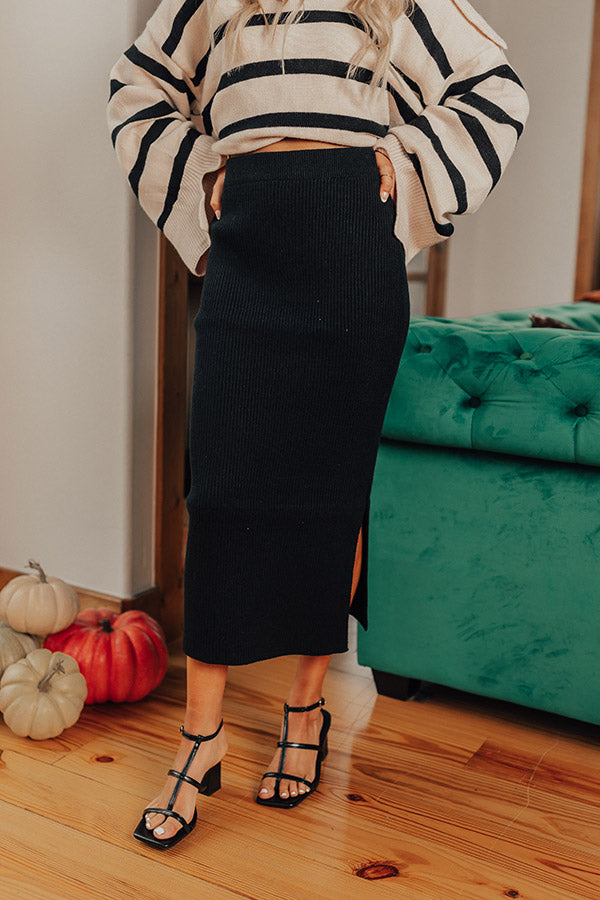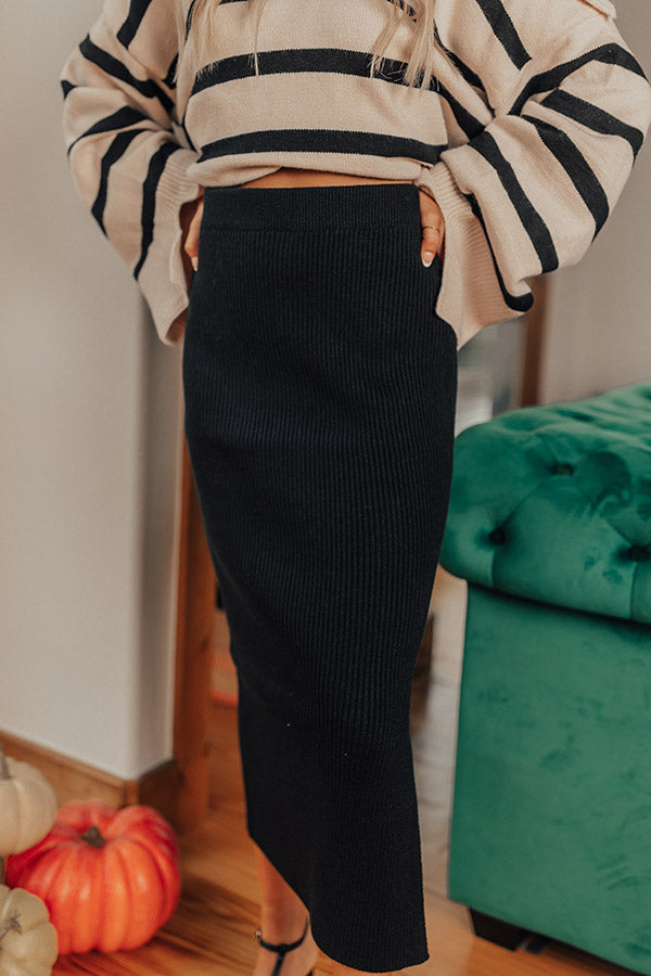 Strut through your day in style in our chic black 'Coffee And Smiles' skirt featuring thick knit material with ribbed texturing, a high waistline, and a flattering figure hugging silhouette that ends in a straight mid-calf length hemline!