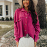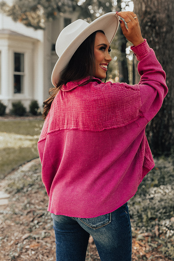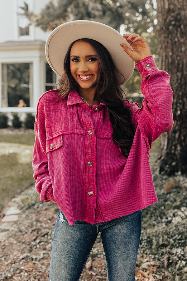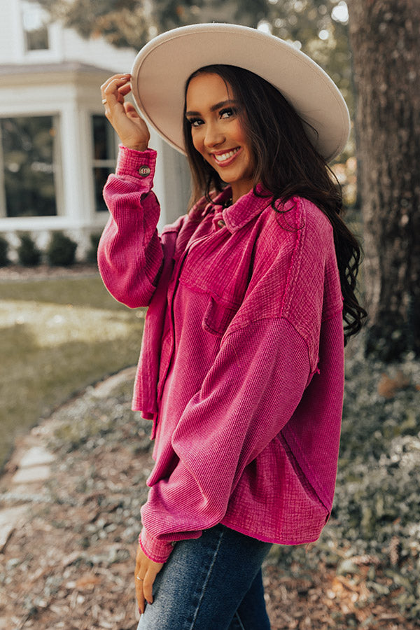 Keep warm and comfortable all fall long in our adorable fuchsia colored 'Coffee At Sunrise' top featuring waffle knit material, a button down front with a collared neckline, long loose sleeves with button closure cuffs, two chest pocket cuts with flap closures, and a relaxed silhouette that ends in a straight hemline!