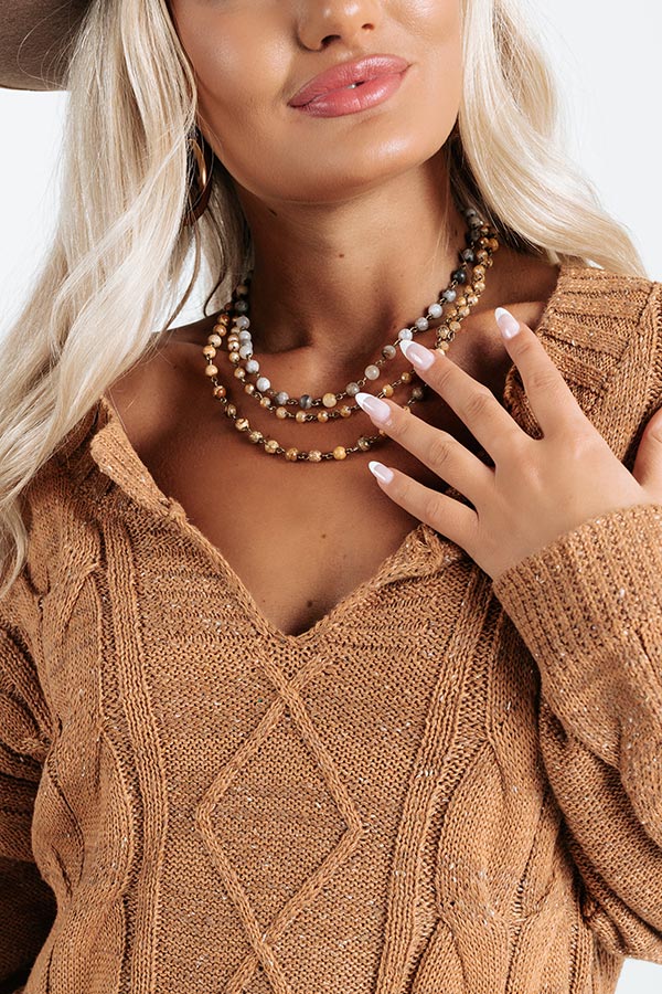 Elevate your look with our beautiful 'Coffee Blend' necklace featuring three natural and blue hued beaded layered chains!