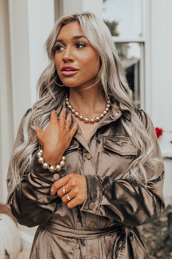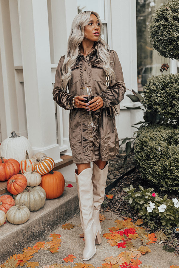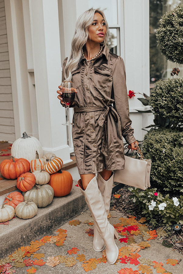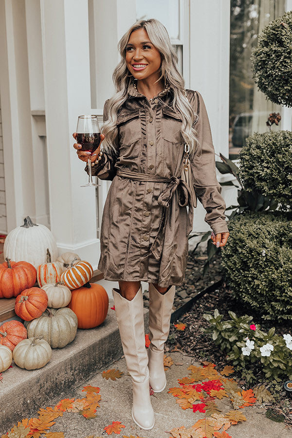 Meetup with your best gal pals in style with this pretty dark martini olive colored dress featuring faux suede material, a button down front with a collared neckline, long loose sleeves with button closure cuffs, a matching tie belt, two accent pockets with flap closures, and a flattering silhouette that ends in a straight lower-thigh length hemline!