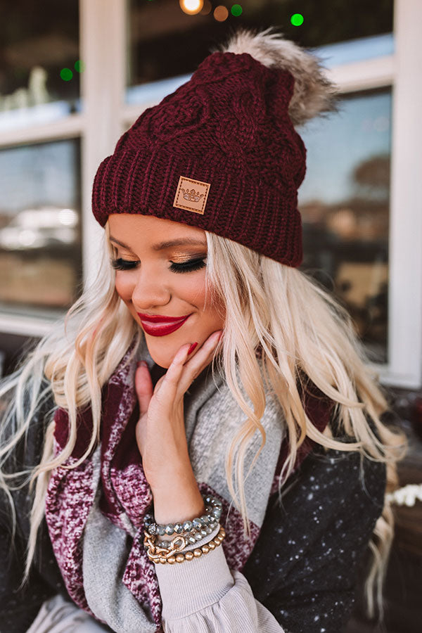 Stay warm during those cold winter nights with this charming maroon colored beanie featuring warm lightweight and stretchy large knit material, a rolled silhouette, ultra soft fleece lining, and a faux fur pom accent!