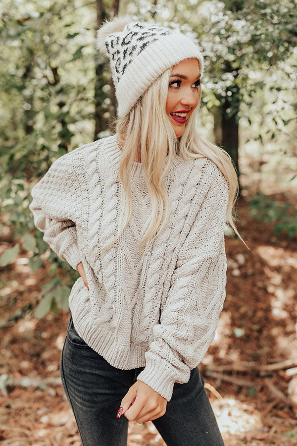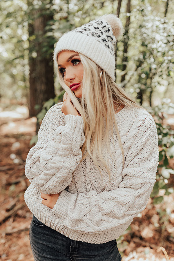 Stay warm during a "cold rush" with this adorable ivory colored beanie featuring soft lightweight tight knit material patterned with a bold black and grey leopard print, wide rolled trim with ribbed texturing, and accent faux fur pompom!