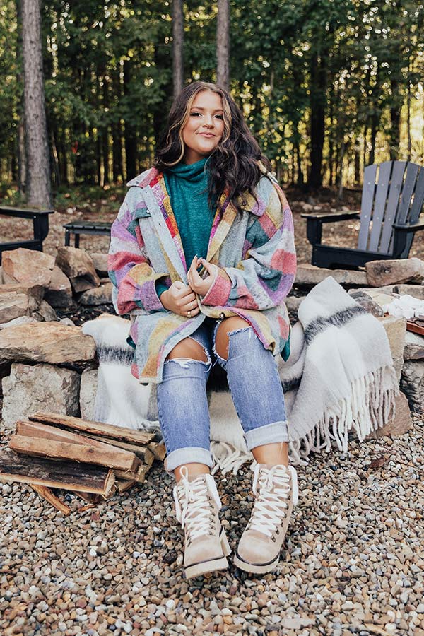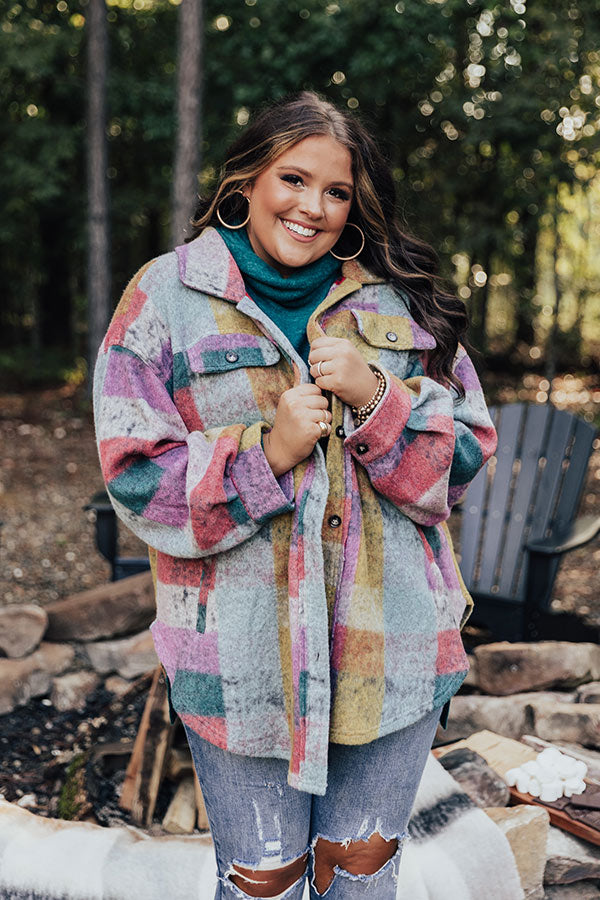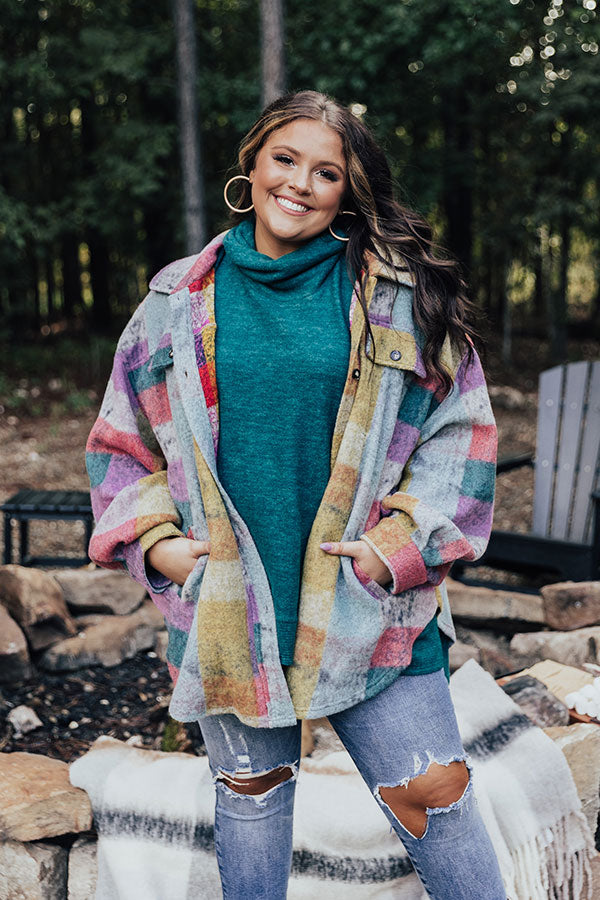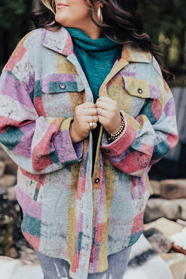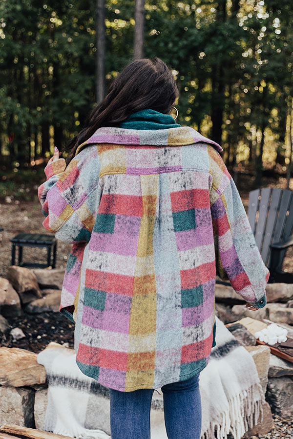 Get ready for colder days ahead in the most stylish way with this vibrant jacket featuring warm material patterned with a fuchsia, teal, mustard, and hot plaid print, a button down front with a collared neckline, long loose sleeves with button closure cuffs, two accent chest pockets with flap closures, and a relaxed silhouette that falls into a rounded hemline! Measurements