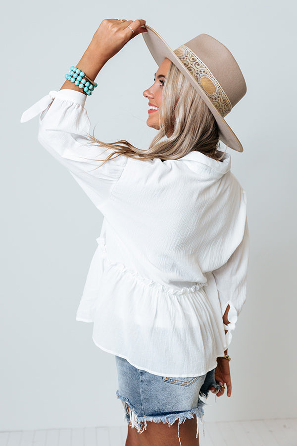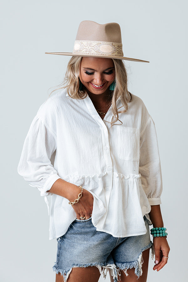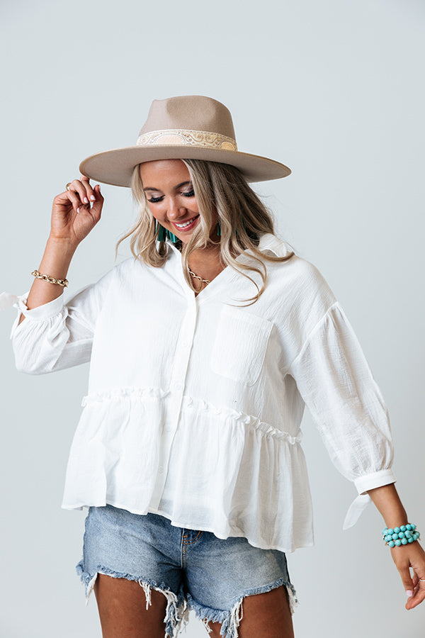 Be the author of your own fashion story with this charming white shift top featuring lightweight breezy material with subtle texturing, a button up front with a collared neckline, loose 3/4-lenth sleeves with tie closure cuffs, a single accent chest pocket, and a relaxed silhouette that ends in a peplum hemline!