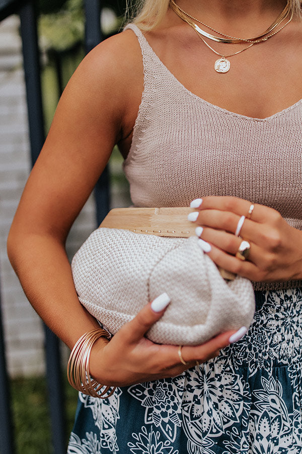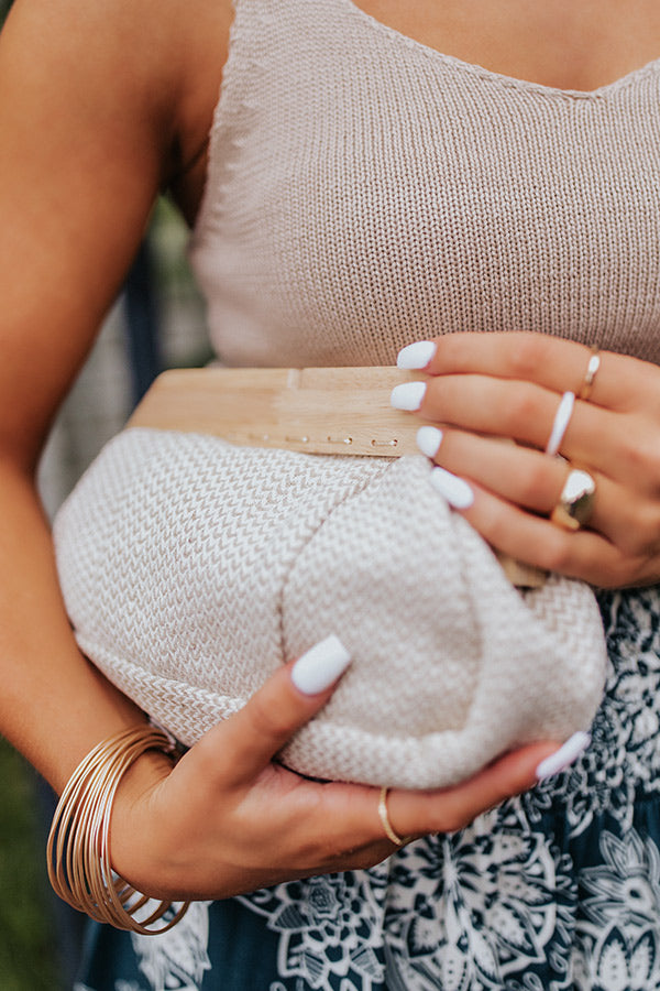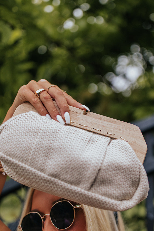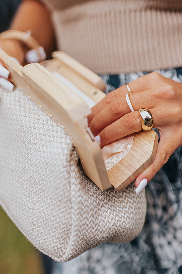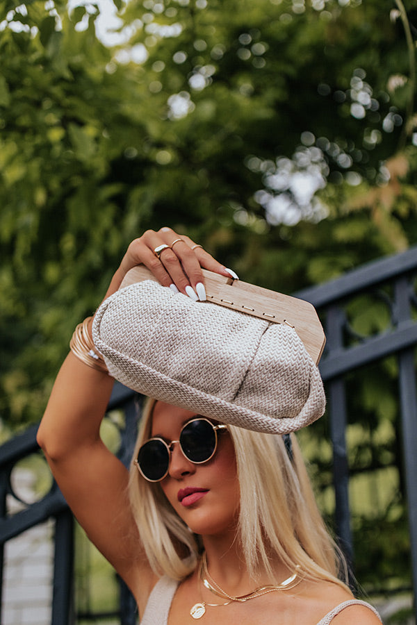 You won't find a cuter summer back than our adorable 'Collecting Stories' clutch featuring lightweight birch hued woven material, a removable gold chain shoulder strap, a snap closure with wood accents, and a fully lined pouch with an additional inside pocket!
