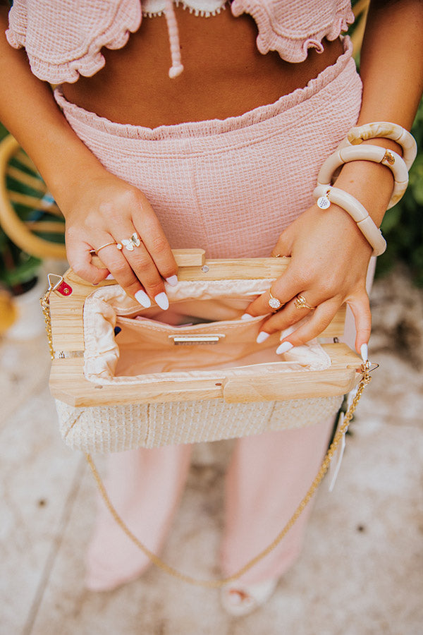You won't find a cuter summer back than our adorable 'Collecting Stories' clutch featuring lightweight cream woven material, a removable gold chain shoulder strap, a snap closure with wood accents, and a fully lined pouch with an additional inside pocket!