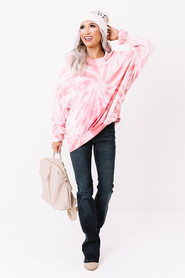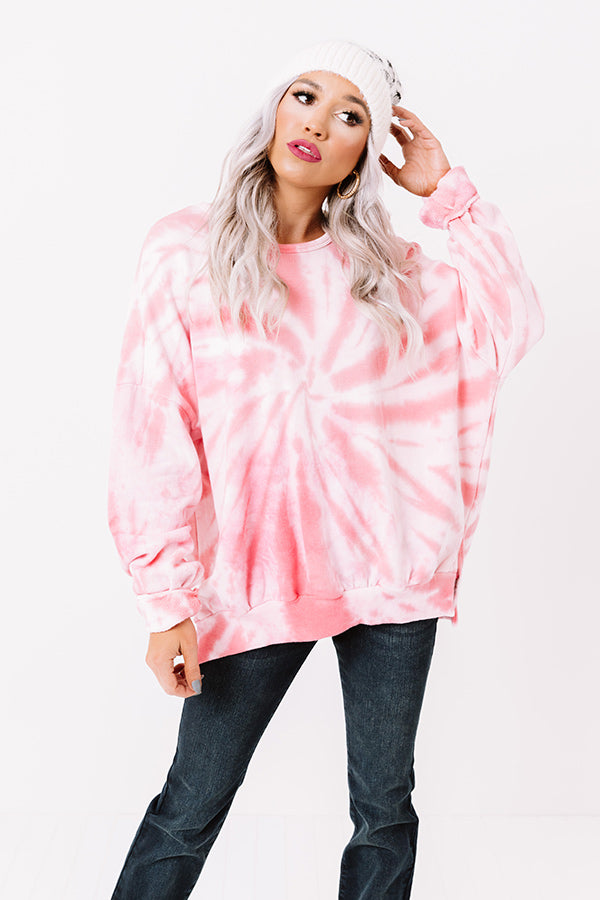 There is no need to get our of your "comfort zone" when you have this trendy and comfy white sweatshirt in your closet! It features soft lightweight material patterned with a hot pink tie dye print, a high rounded neckline, long loose sleeves with fitted cuffs, and a relaxed silhouette that falls into a wide straight hemline!