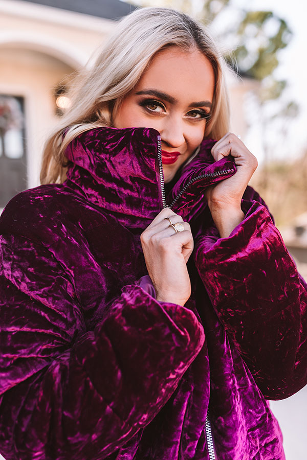 Get all comfy and cozy in this gorgeous merlot colored jacket featuring ultra soft and warm velvet material, a zip front closure with a high collar neckline, long loose sleeves, low accent pockets, and a bomber silhouette that ends in a straight hemline that can be cinched! Measurements