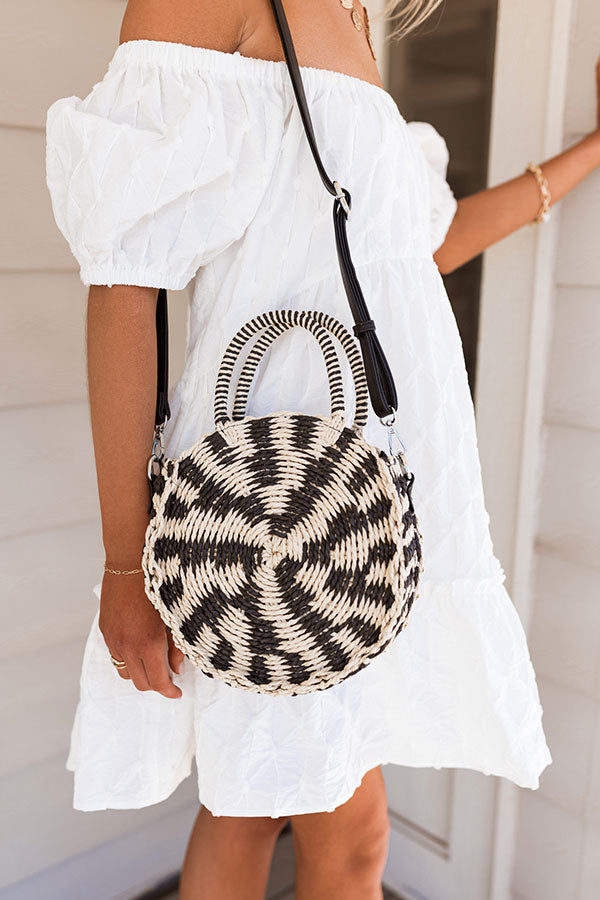 We have no doubt you will be in complete awe when you see how cute this black and natural colored crossbody is with its lightweight woven material, two tote handles, a removable and adjustable shoulder strap, a chic circle silhouette, and a spacious fully lined interior with a zip closure!