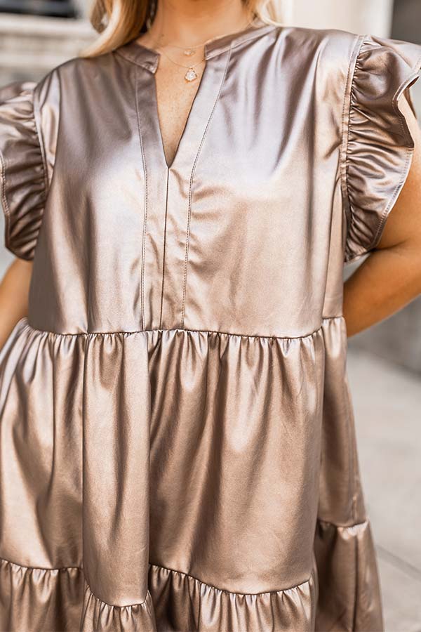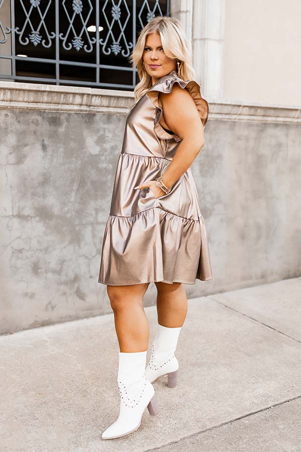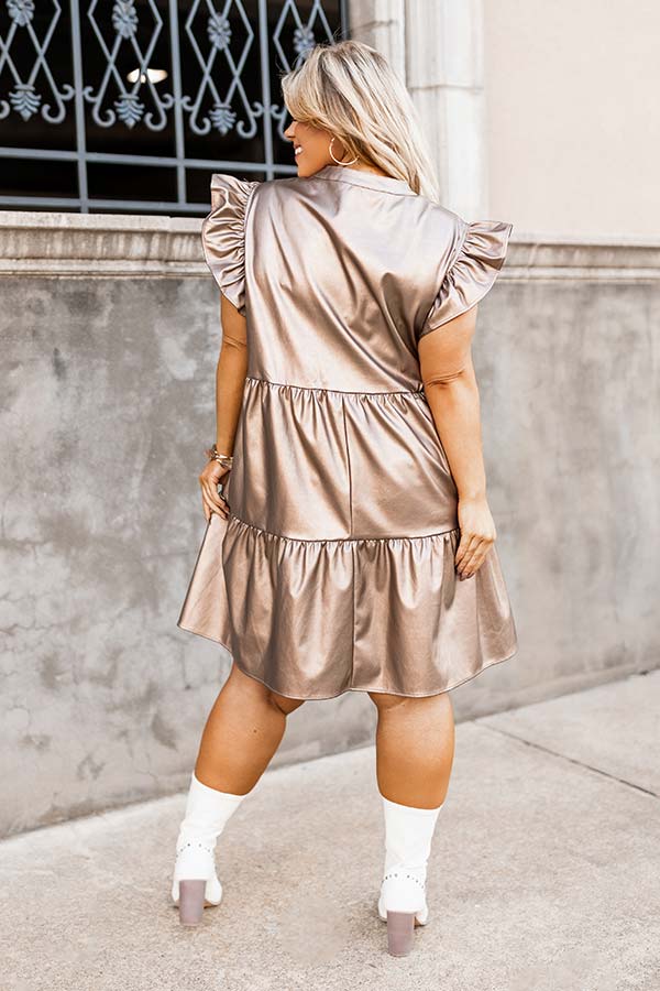 You won't find a better piece to wear to a concert than this edgy taupe plus size dress featuring faux leather material, a v-cut neckline, ruffled cap sleeves, hidden side pockets, and a relaxed tiered skirt silhouette that falls into a straight mid-thigh length hemline!