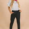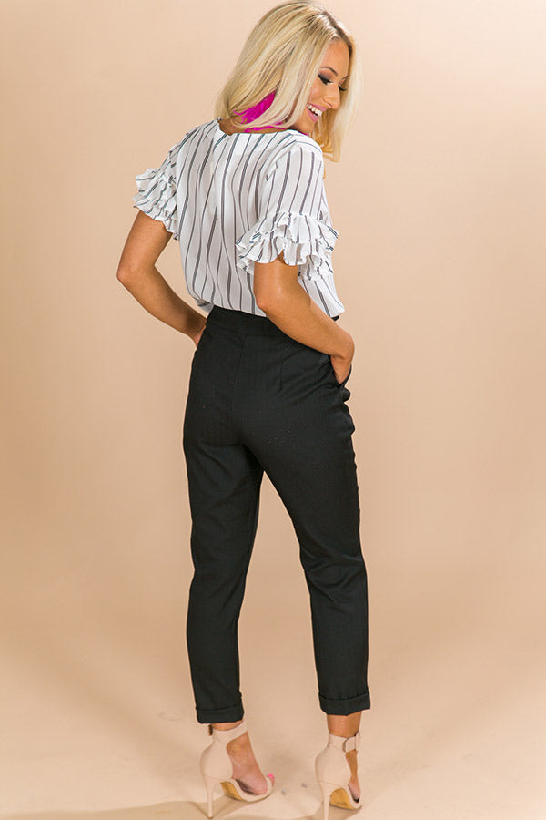Conquer your next conference call in these must-have trouser pants! These high waisted trouser pants have a feminine ruffled waistline with pleat accents, side pockets & a chic tapered leg.