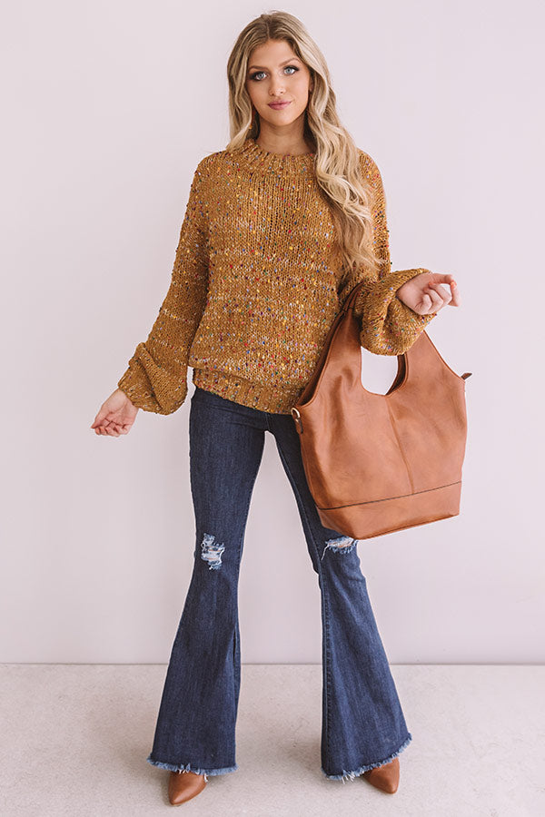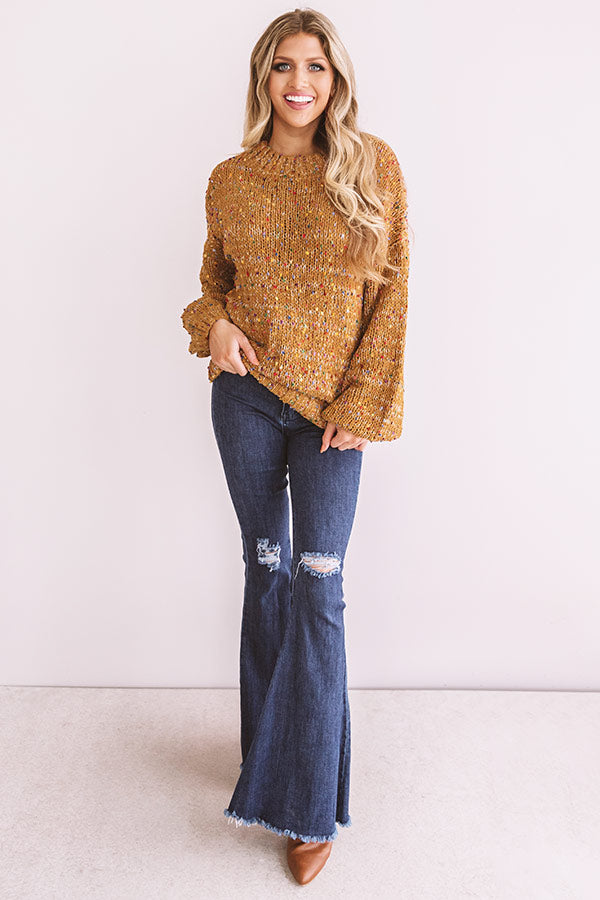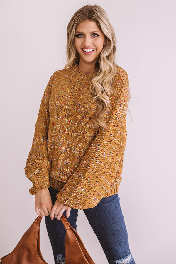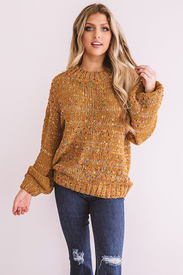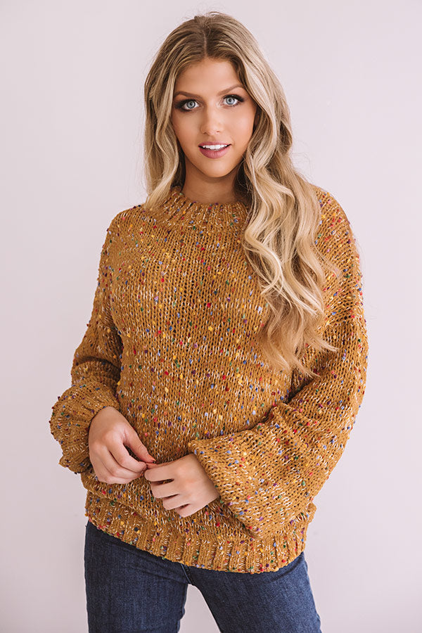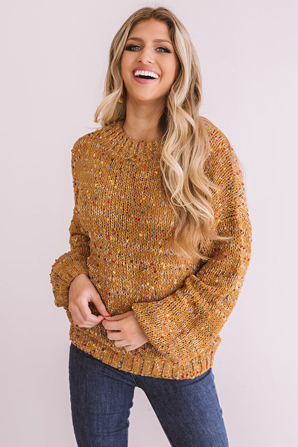 Bring the party in this mustard hued knit sweater featuring soft lightweight tight knit material with colorful confetti drop accents, a high rounded neckline, ribbed trim detailing, long oversized bishop sleeves with fitted cuffs, and an ultra relaxed silhouette that falls into a straight hemline! This adorable piece can be styled a variety of ways, like with some distressed denim flares and a dark neutral bootie and tote, or you can wear it with some frayed black skinnies, "The Mia Faux Suede Lace Up Heel in Hot Pink," and our "Making Music Tassel Earrings in Green!" Measurements