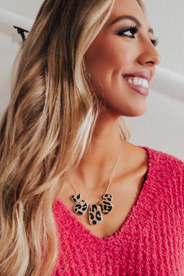 Answer the call of your inner confidence and accessorize with this adorable statement necklace featuring a short dainty gold chain and abstractly shaped pendants patterned with a bold black leopard print!