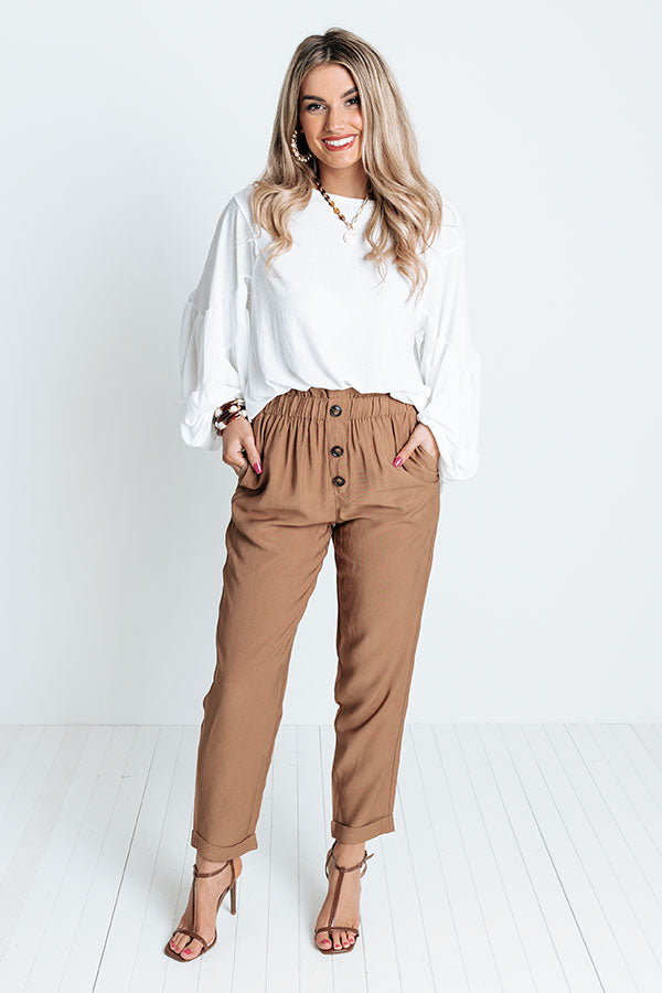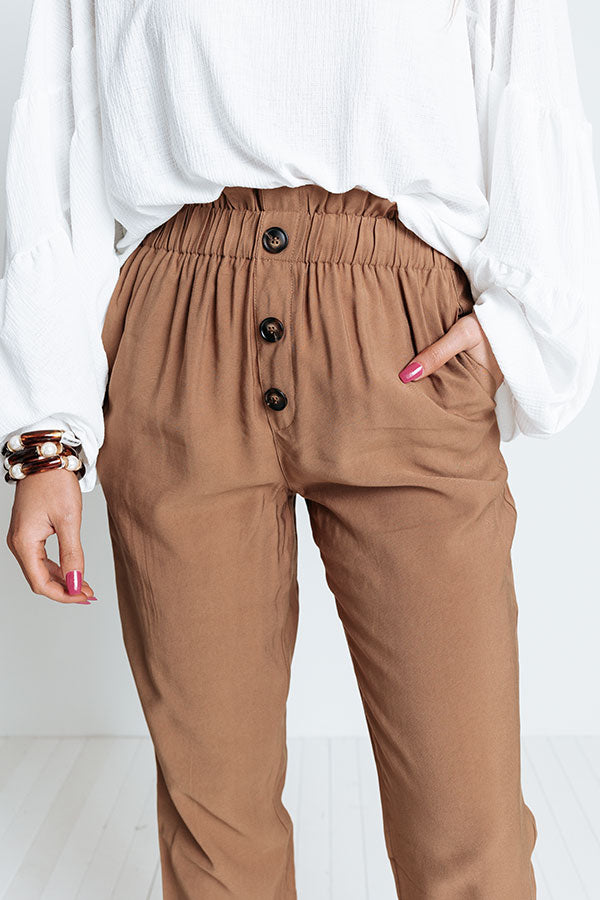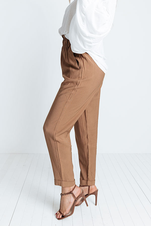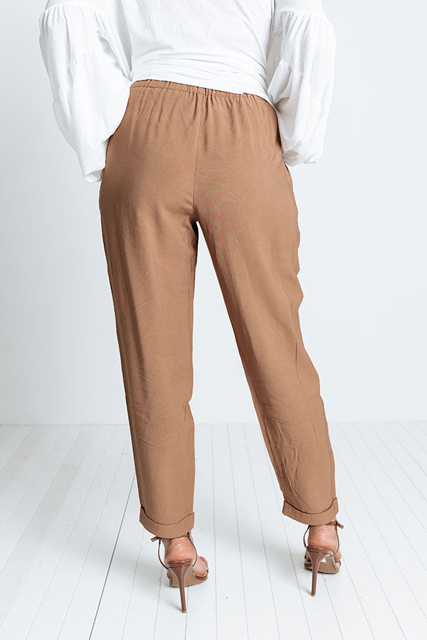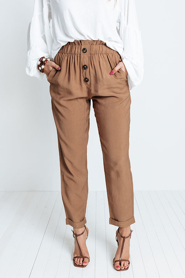 Achieve all your cool ambitions in style with these chic khaki hued pants featuring lightweight material, an elastic high waistline, accent side pockets, a three button closure, and a relaxed silhouette that falls into ankle-length hemlines with rolled cuffs! Measurements