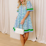 - Effortlessly charming and oh so sweet, this darling mini dress was made for stylish sunny days! With a playful pattern and a timeless silhouette, it's the perfect pick for a look that's both fun and flirty. - Lightweight material with an intricate floral print featuring different green and blue hues - Sky blue and green striped trim - A built-in skirt lining - A v-cut neckline - Short sleeves - Gathered detailing on the skirt - Hidden side pockets - A relaxed silhouette that ends in a mini dress length hemline