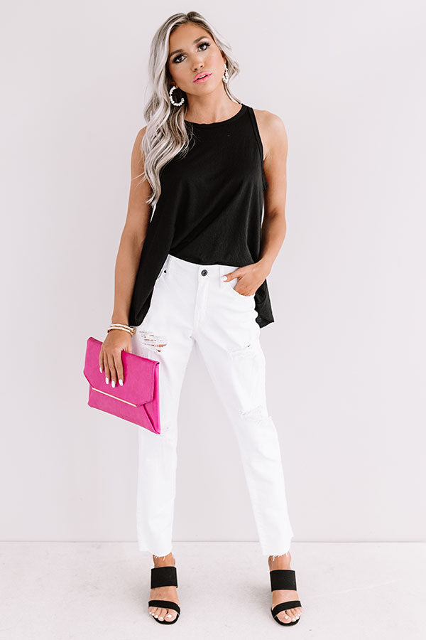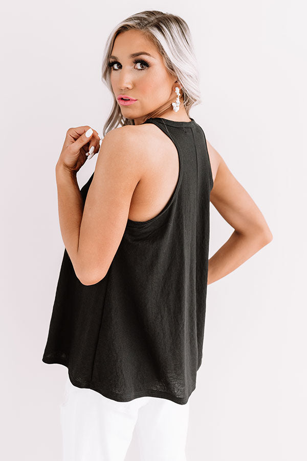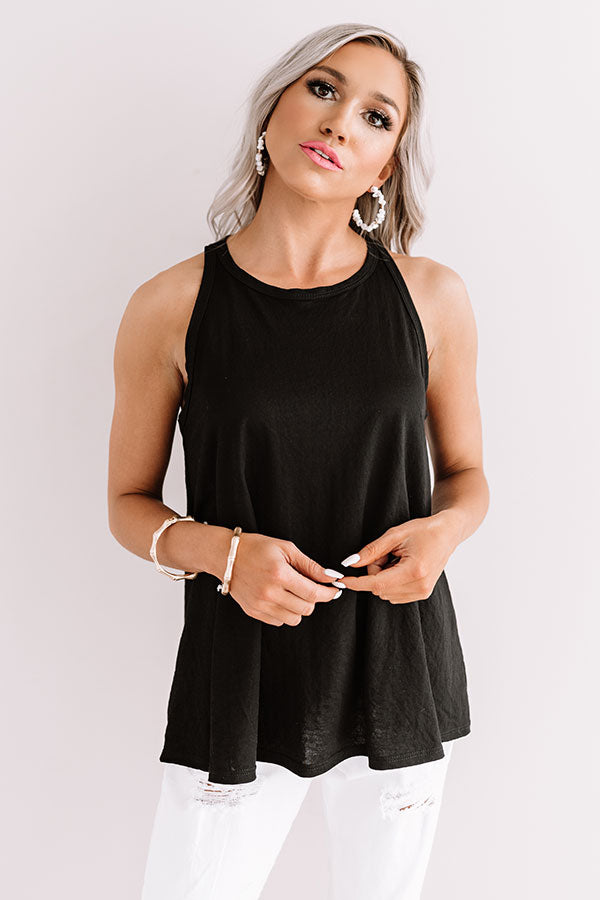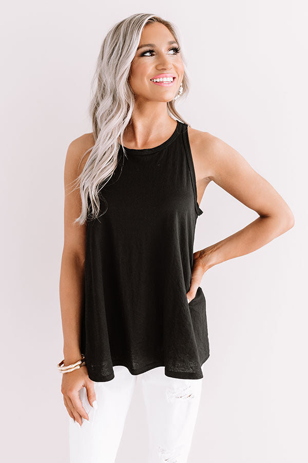 There is no better way to stay "cool in Capri" than with this basic black shift tank featuring ultra lightweight material, a high rounded neckline, 1-inch sleeveless shoulder straps with a racerback fit, and a relaxed silhouette that falls into a straight hemline! Your styling options are endless with this versatile piece! It can paired solo with some frayed white skinnies, black jute wedges, and a hot pink clutch, or you can wear it layered under a grey knit cardigan with some distressed denim shorts, "The Allen Wedge in Snake Print," and our "Times Square Kisses Snake Print Tote in Grey!" Measurements