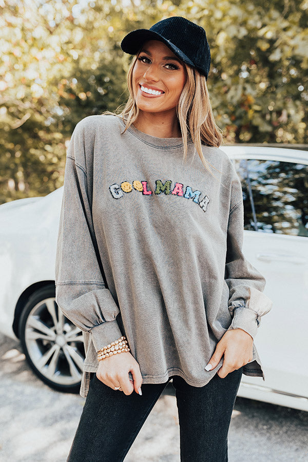 Be a 'Cool Mama' in our adorable lightweight cotton sweatshirt! Features a soft plush design traced beautifully with black sequins, a crew neckline, long loose sleeves with fitted cuffs, a subtle high-low cut, and a flattering silhouette with accent slits.