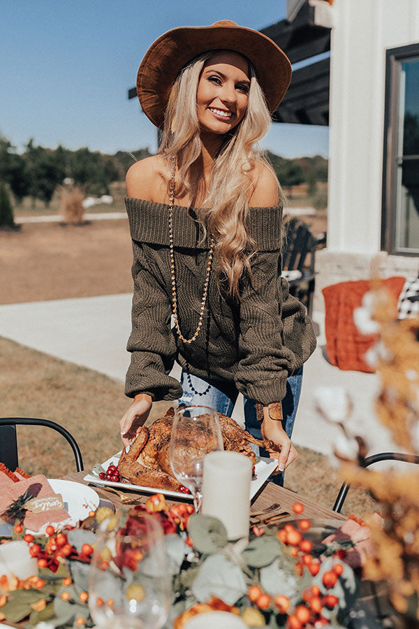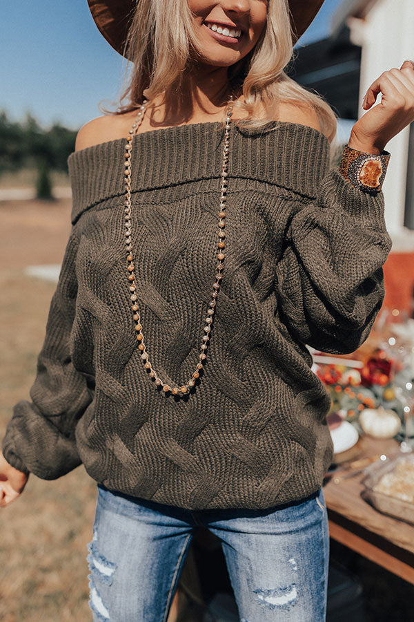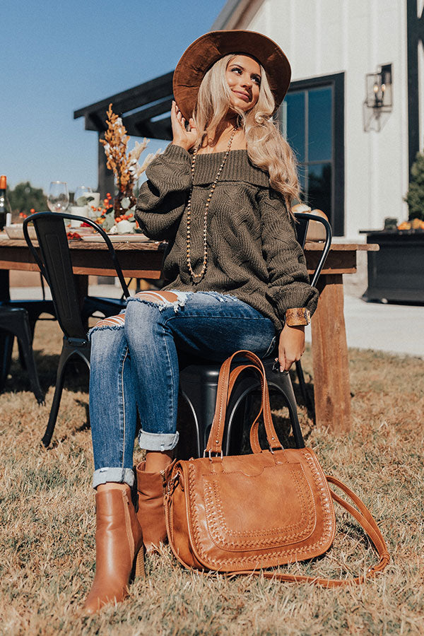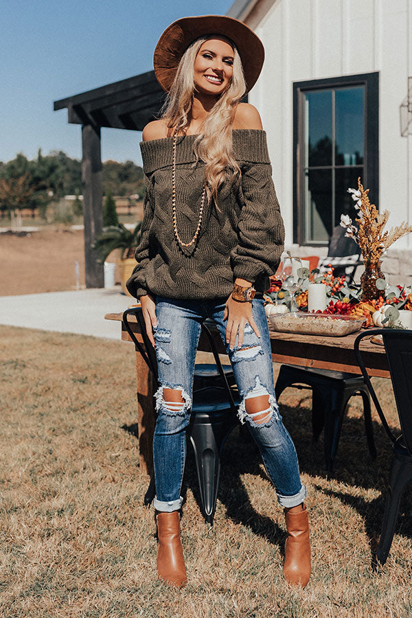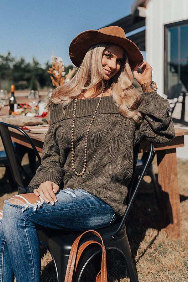 You will undoubtedly be everyones "cool weather crush" when you wear this martini olive colored tunic sweater featuring thigh loose knit material with subtle ribbed texturing and braided detailing, an off the shoulder fit with a rolled neckline, long oversized bishop sleeves with fitted cuffs, and a relaxed silhouette that falls into a straight upper thigh length hemline! We have styled warm fall essential with some distressed ankle skinnies and a neutral bootie, faux suede hat, and tote, but you can also wear it with some charcoal flares and "The Seraphina Faux Leather Wedge in Grey!" Measurements