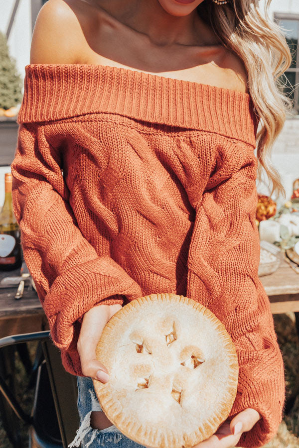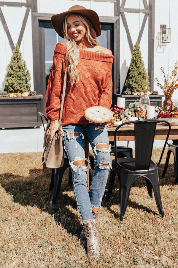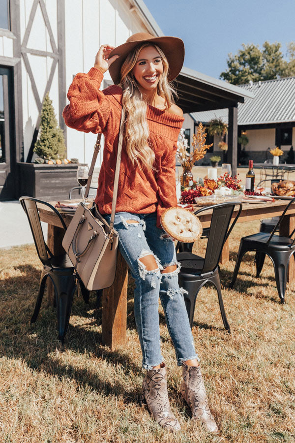 You will undoubtedly be everyones "cool weather crush" when you wear this rust colored tunic sweater featuring thigh loose knit material with subtle ribbed texturing and braided detailing, an off the shoulder fit with a rolled neckline, long oversized bishop sleeves with fitted cuffs, and a relaxed silhouette that falls into a straight upper thigh length hemline! We have styled warm fall essential with some distressed ankle skinnies, snake print booties, and a neutral tote and faux suede hat, but you can also wear it with some charcoal flares and "The Seraphina Faux Leather Wedge in Grey!"